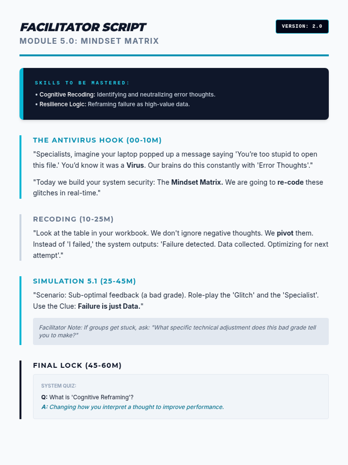 A detailed facilitator script for Lesson 5 (Mindset Matrix), covering the 'Antivirus' hook, cognitive re-coding instruction, the 'Bad Grade' failure reframe role-play, and the wrap-up integrity quiz. Revised for better layout and content completeness.