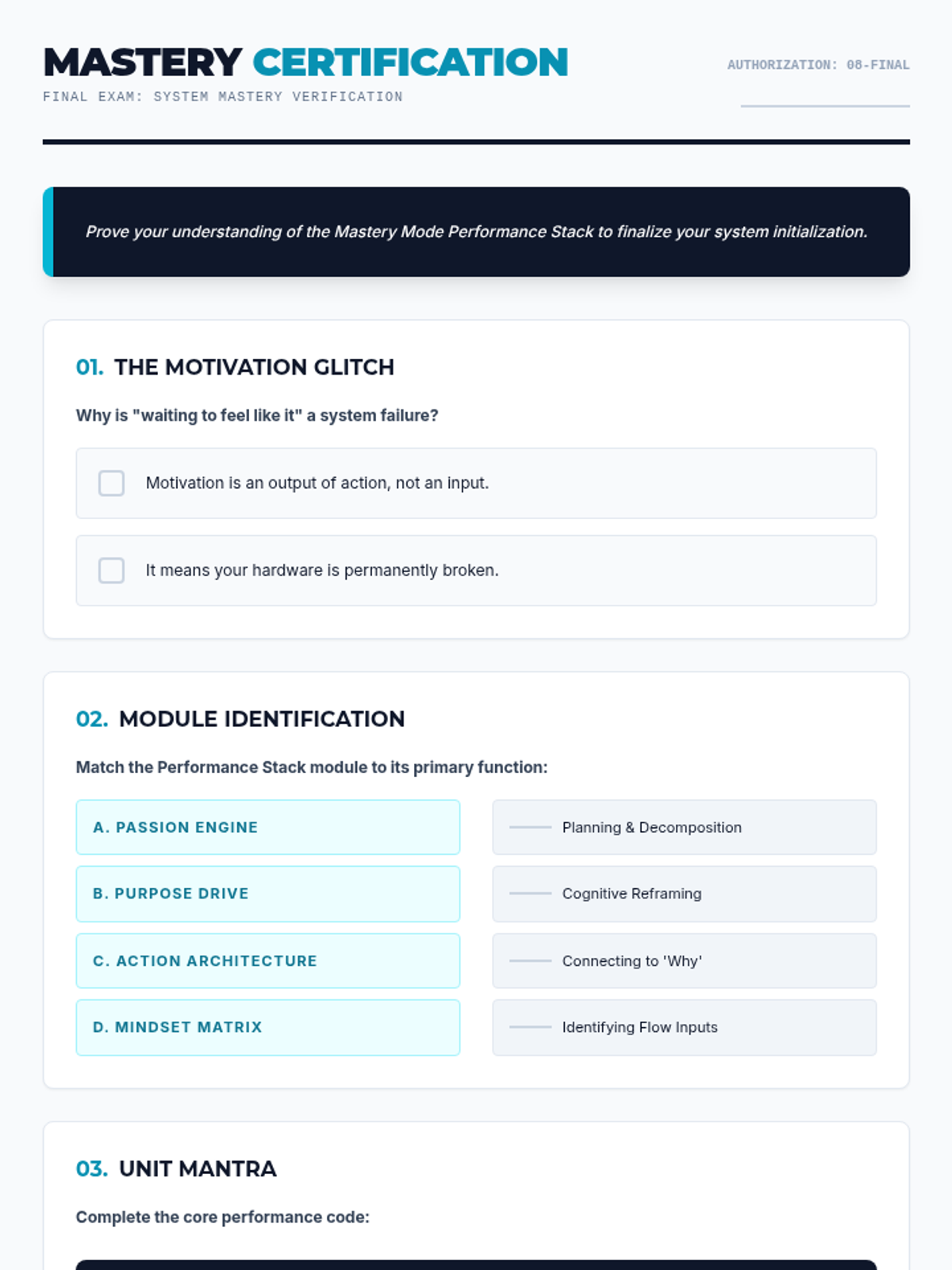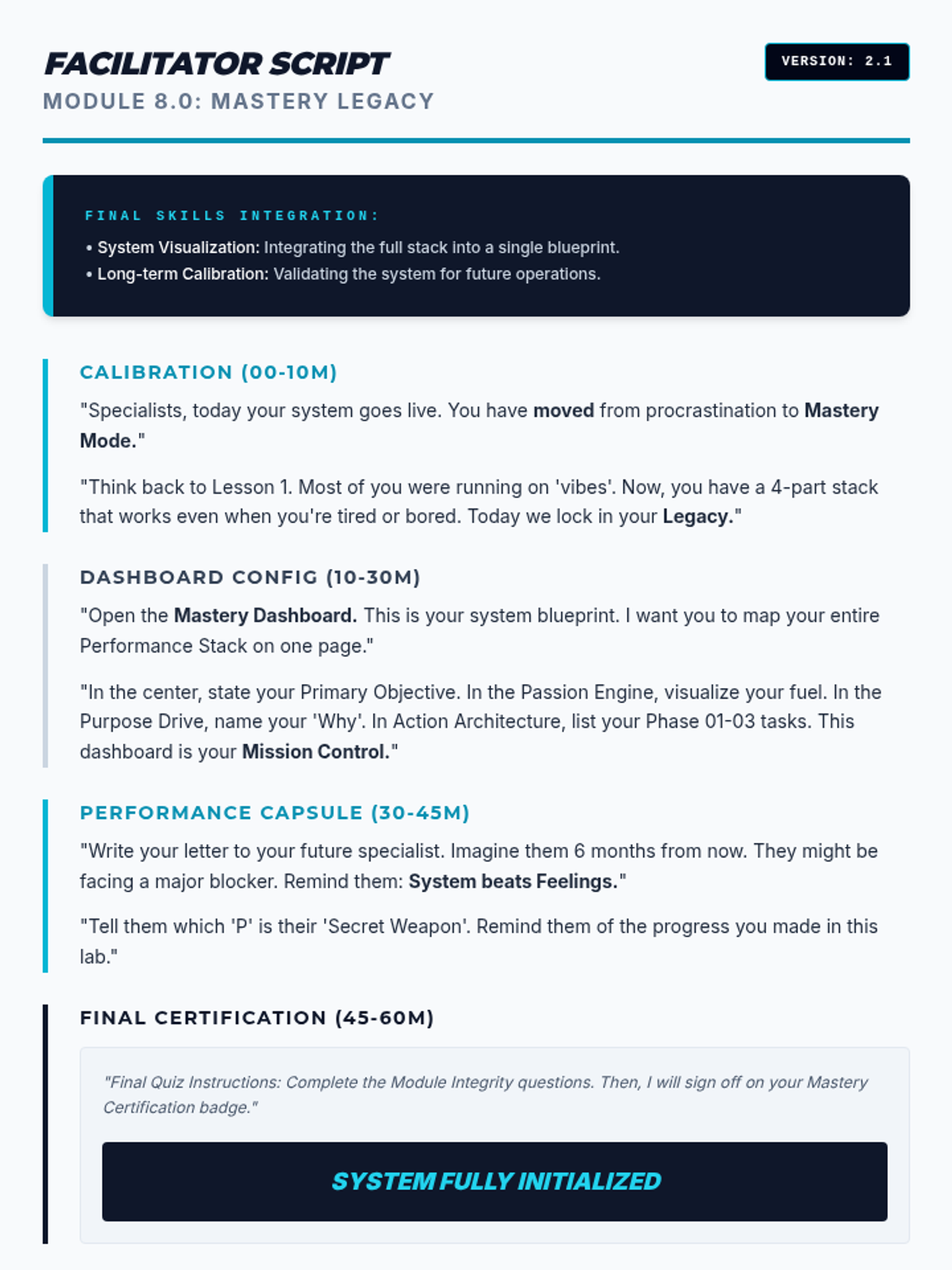 A detailed facilitator script for Lesson 8 (Mastery Legacy), covering the final calibration hook, the Mastery Dashboard configuration, the 'Performance Capsule' letter-writing, and the final certification ceremony. Revised for better layout and content completeness.