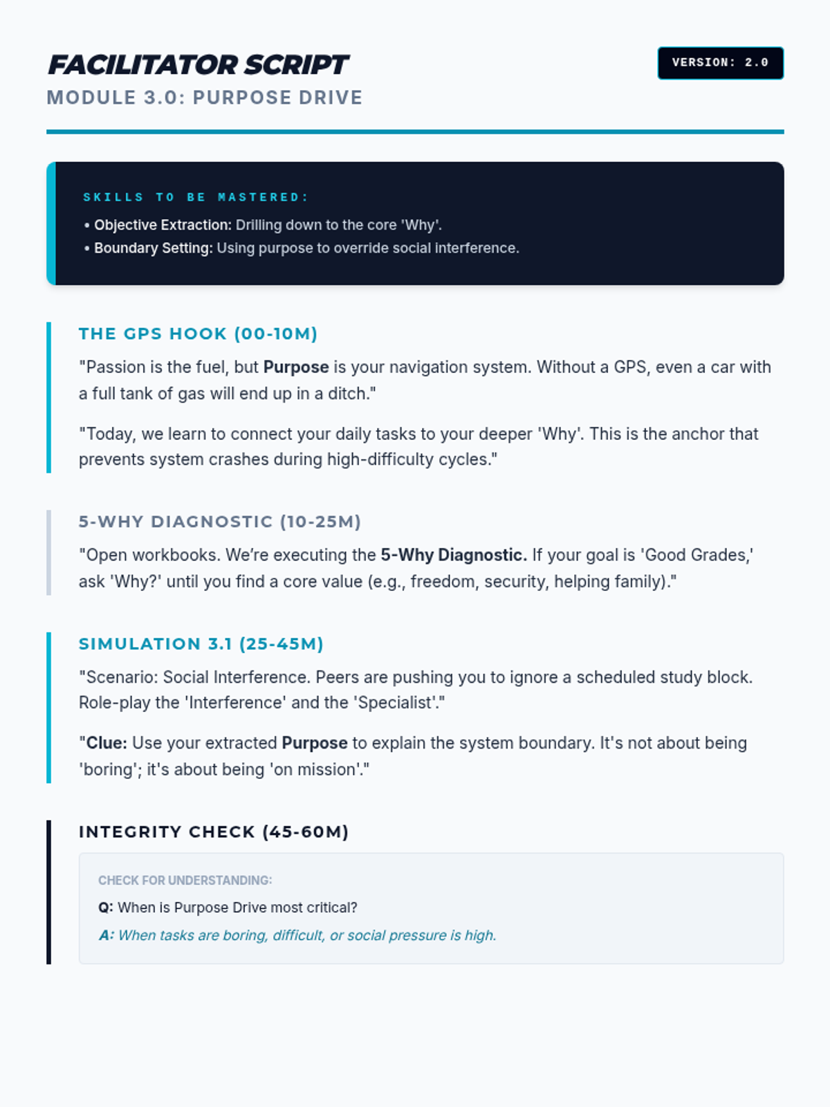 A detailed facilitator script for Lesson 3 (Purpose Drive), covering the 'GPS' hook, the 5-Why Diagnostic tool instruction, the 'Social Interference' role-play, and the purpose integration wrap-up. Revised for better layout and content completeness.