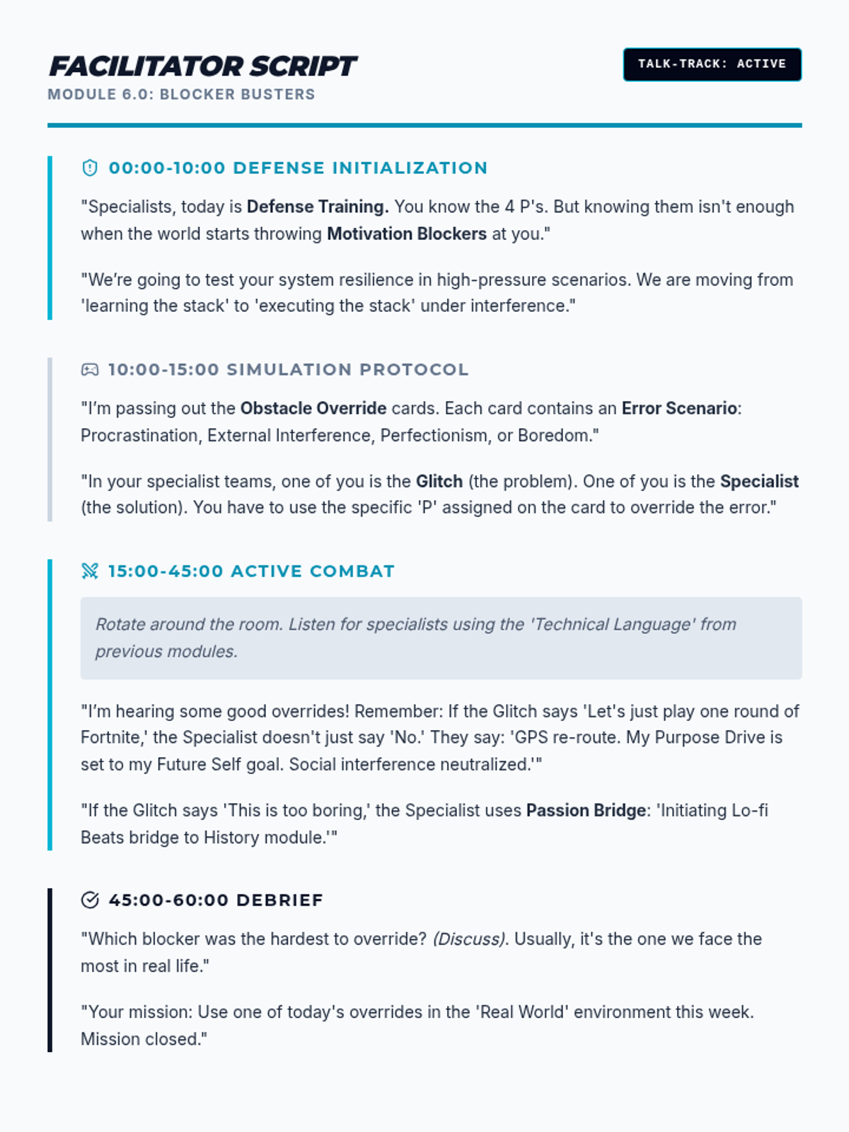 A detailed facilitator script for Lesson 6 (Blocker Busters), focusing on 'Defense Training', the Simulation Protocol for the override cards, guided role-play feedback, and a real-world application debrief. Revised for better layout and content completeness.