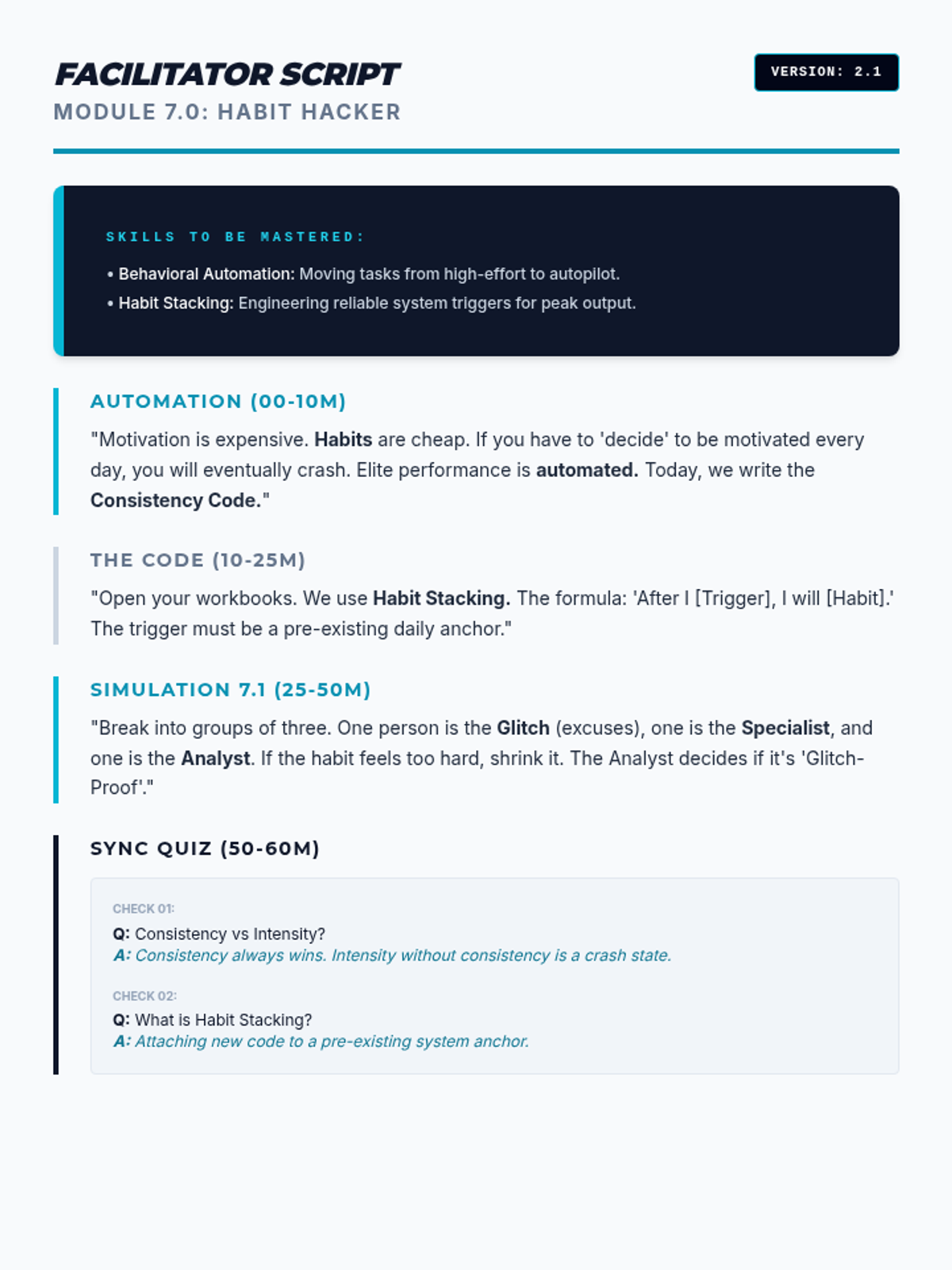 A detailed facilitator script for Lesson 7 (Habit Hacker), covering the 'Automation' hook, habit stacking instruction, peer-review protocol for small habits, and the 'Consistency > Intensity' wrap-up. Revised for better layout and content completeness. Fixed page breaks.