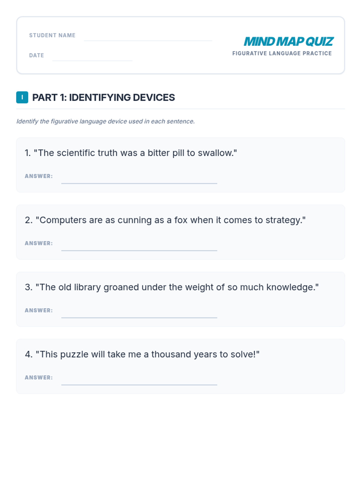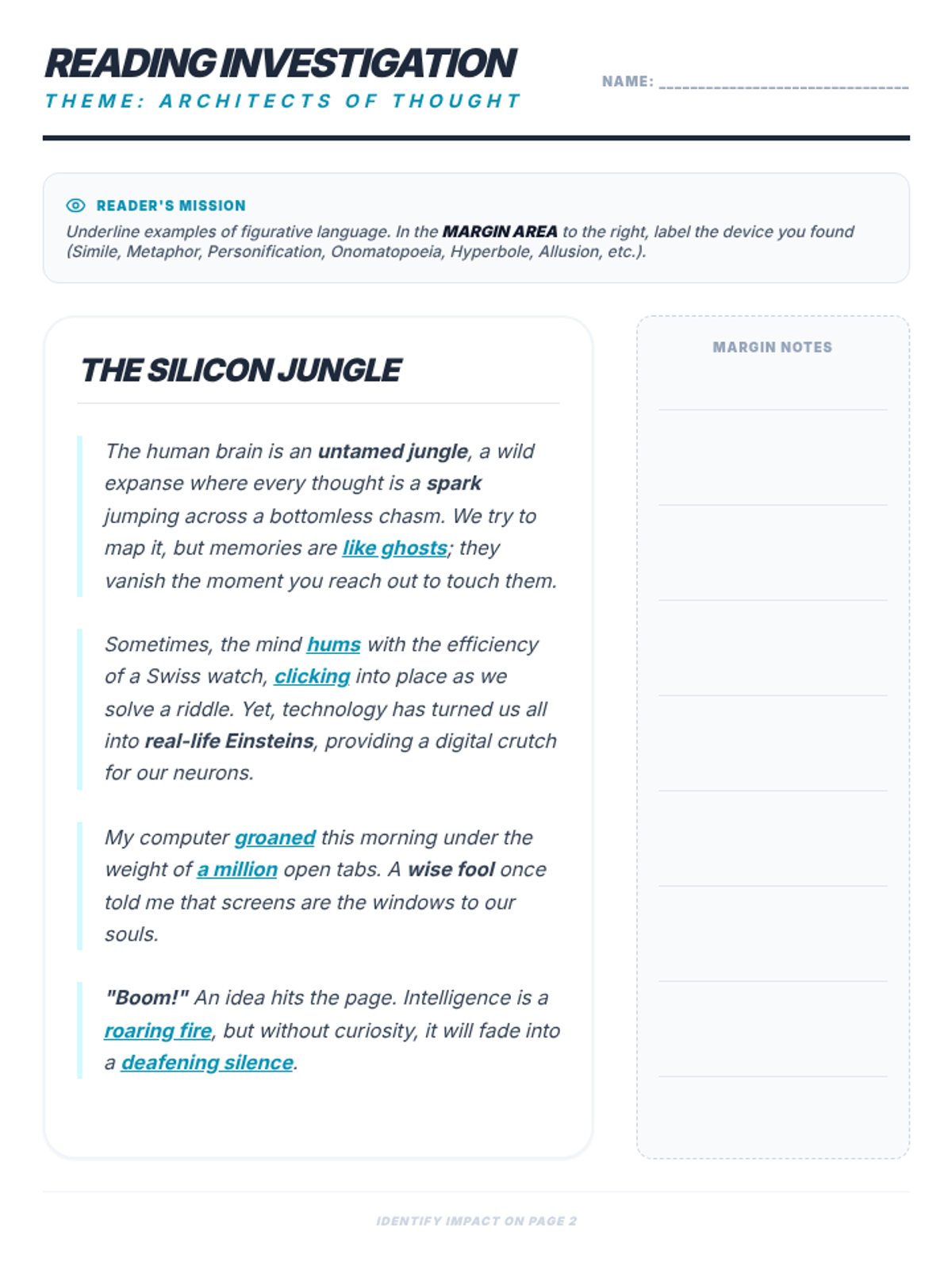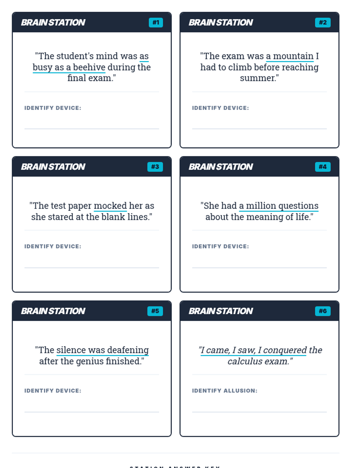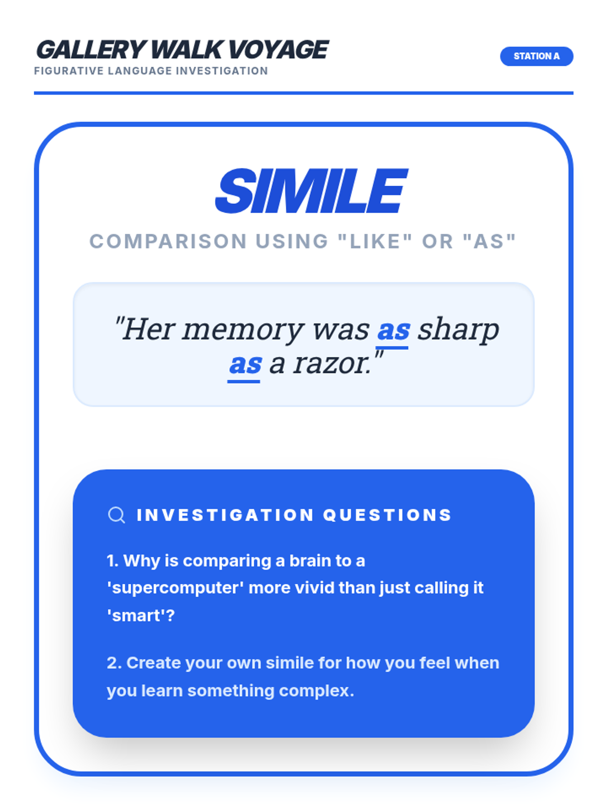 A set of 8 large-format gallery walk posters for figurative language. Each poster features a unique vibrant color theme (Purple, Pink, Green, Yellow, Red, Blue, Orange, Indigo), key terms, definitions, examples, and investigation questions for student reflection.