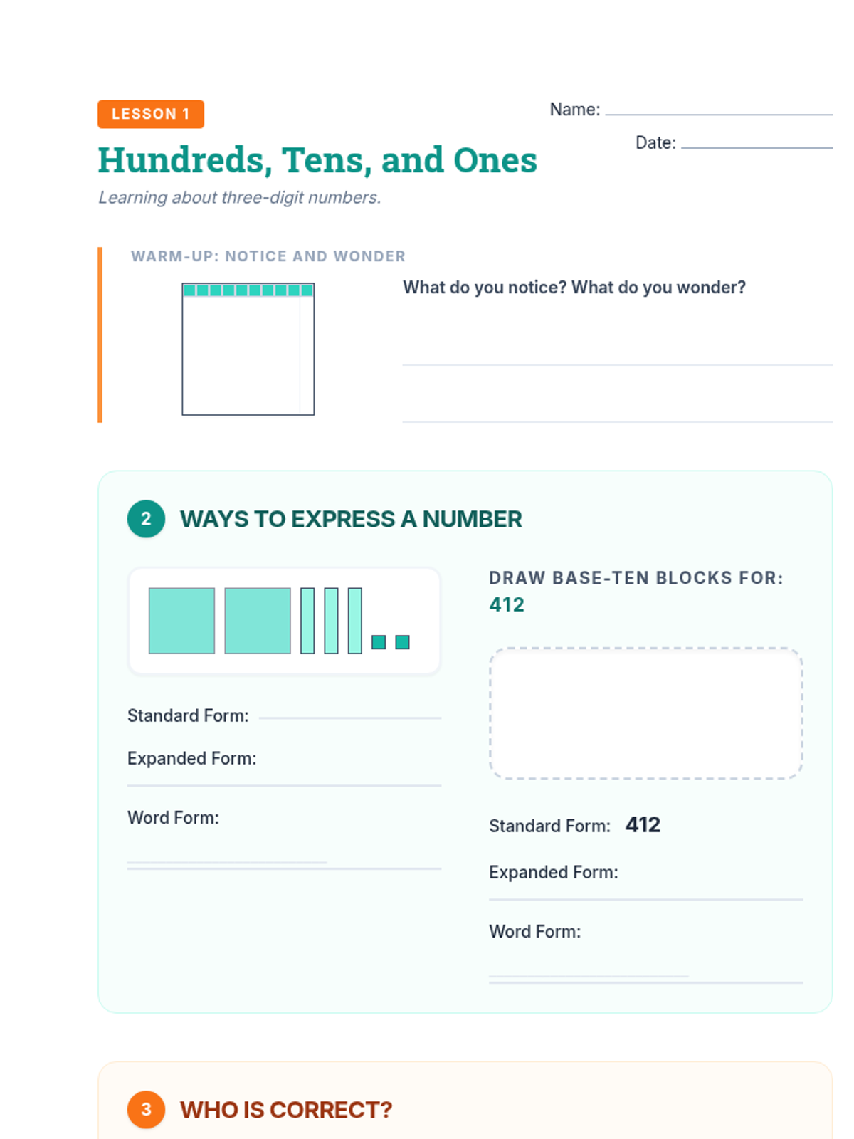 Revised Lesson 8 adaptation with corrected visual arrays for student reference, improved page breaks, and higher contrast labels and answer lines for better accessibility.