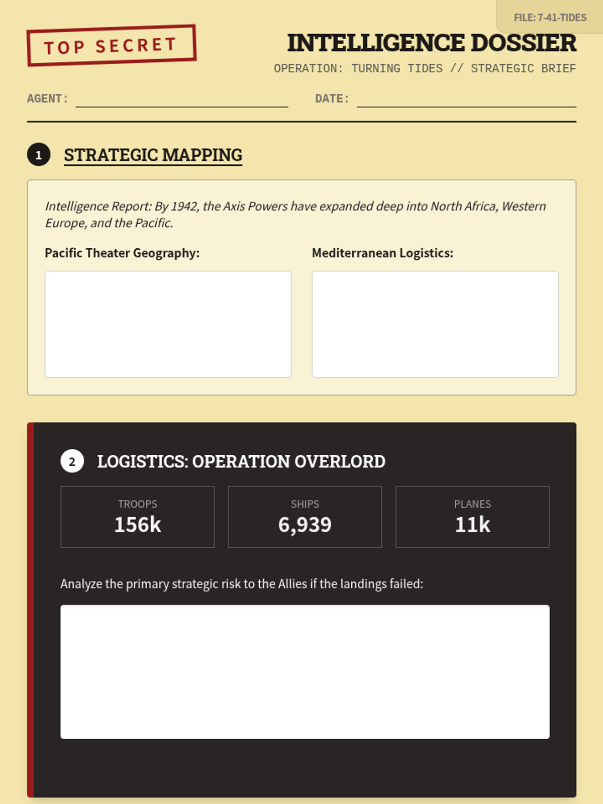 A student worksheet designed as a military intelligence dossier, featuring map analysis, primary source study of Stalingrad, and logistical analysis of D-Day.