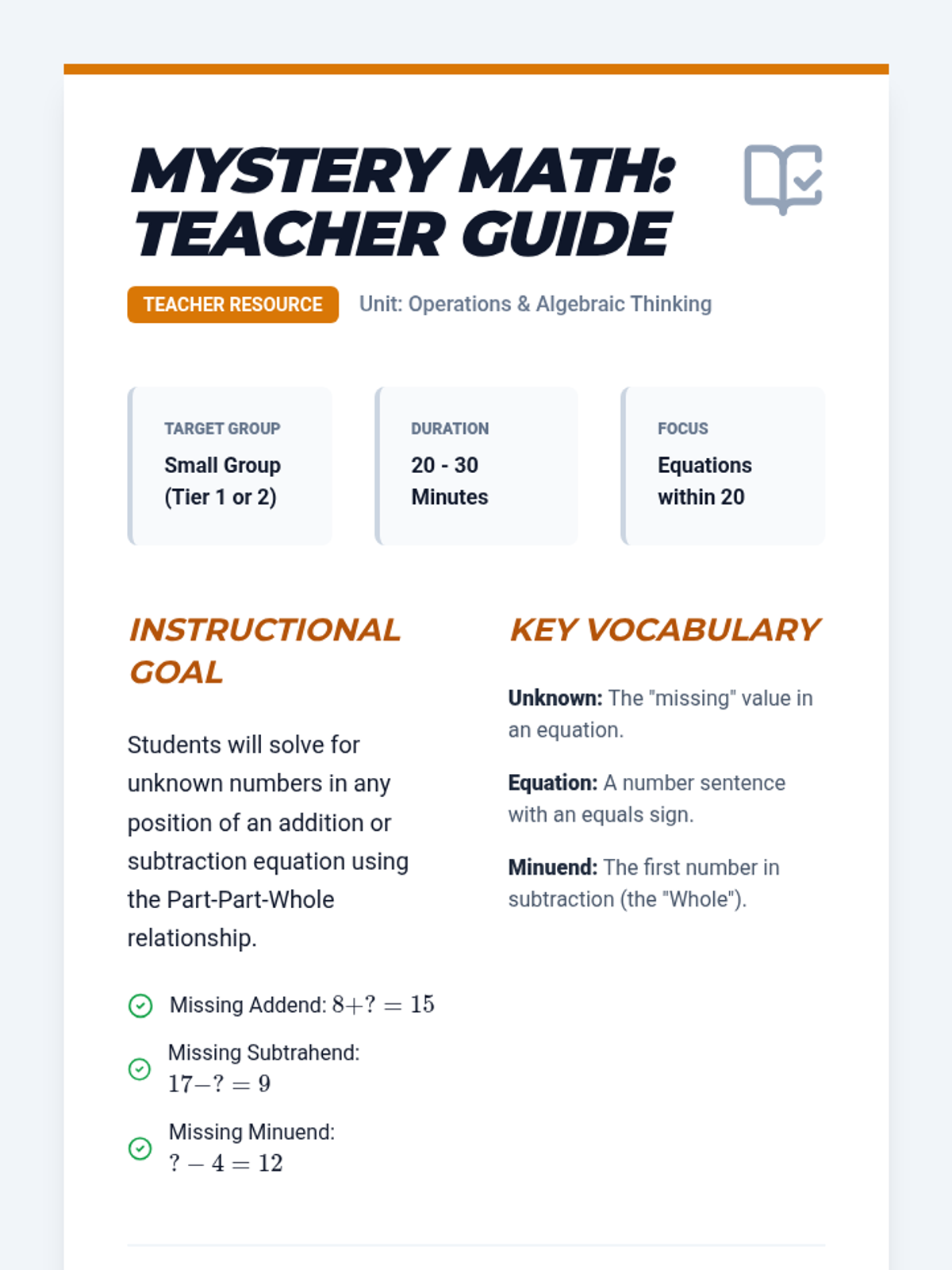 A comprehensive teacher facilitation guide for the Mystery Math lesson. Includes a step-by-step instructional script, common student misconceptions to watch for, and a full answer key for the student worksheet.