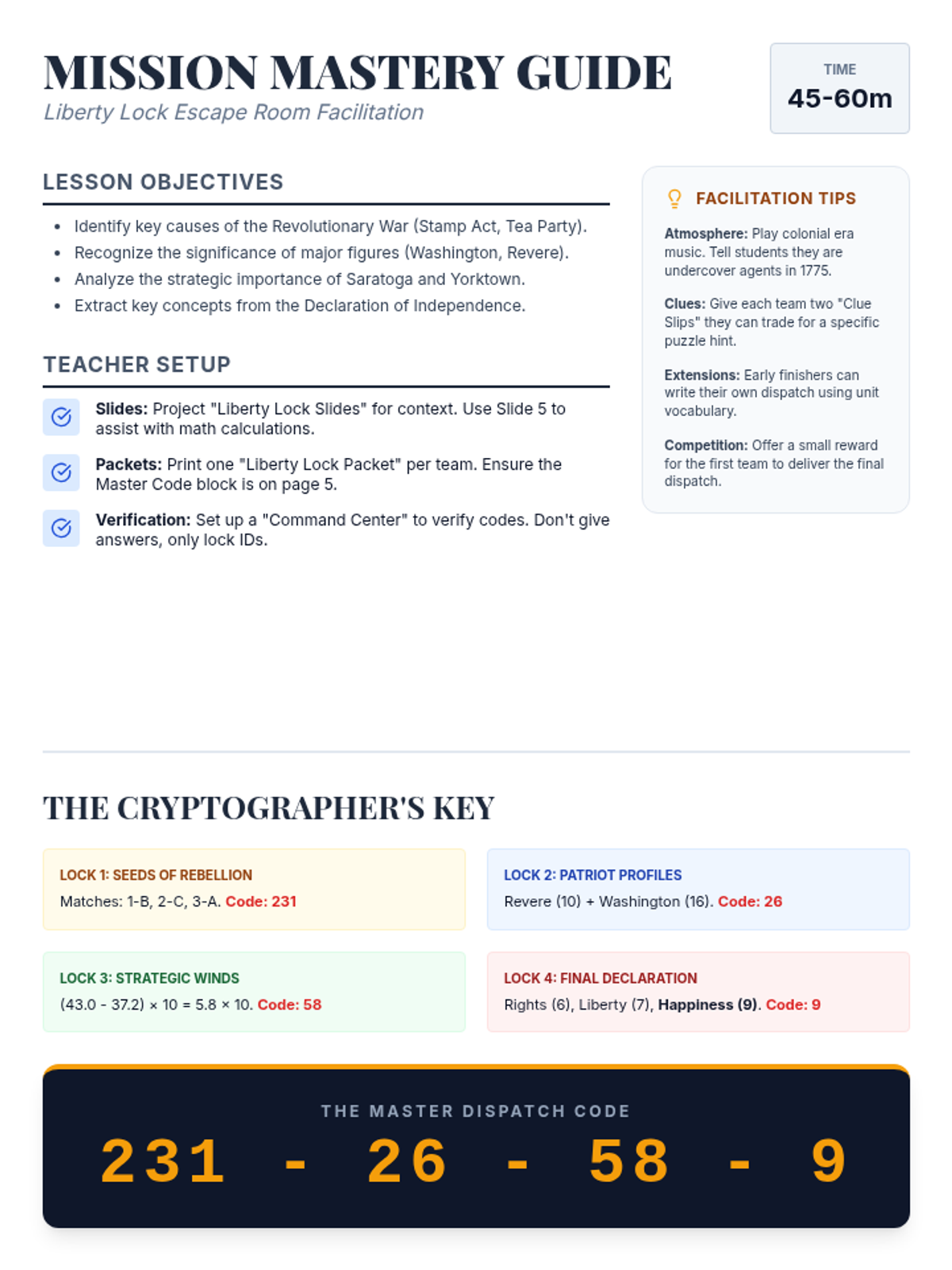 A comprehensive teacher-facing guide. Updated to fix page breaks, include full answer logic for Lock 4, and condense all key information onto a single polished page.