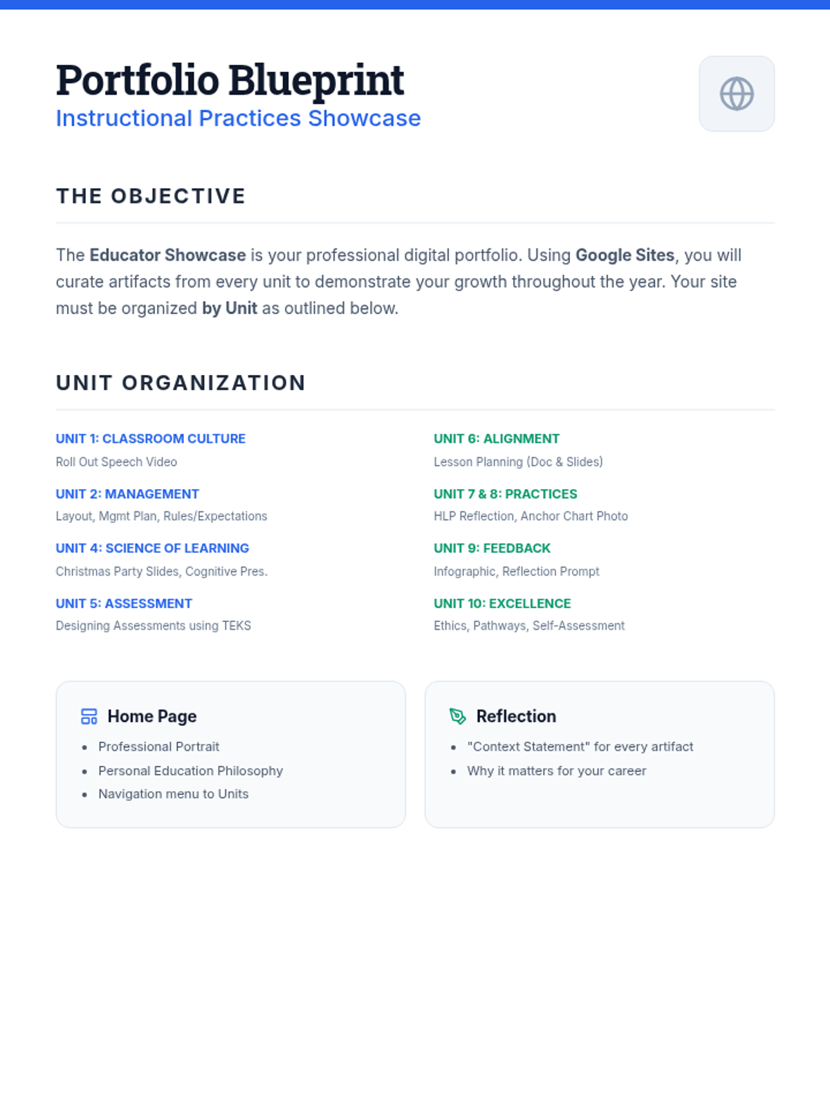 A detailed project guide for students, outlining the unit-by-unit organization of their professional Google Site portfolio and providing a master checklist of all required artifacts.