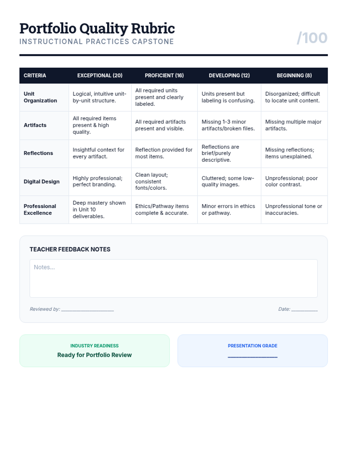 A comprehensive grading rubric for the Educator Showcase portfolio project, evaluating students on unit-based organization, artifact mastery, reflection depth, digital design, and professional excellence.