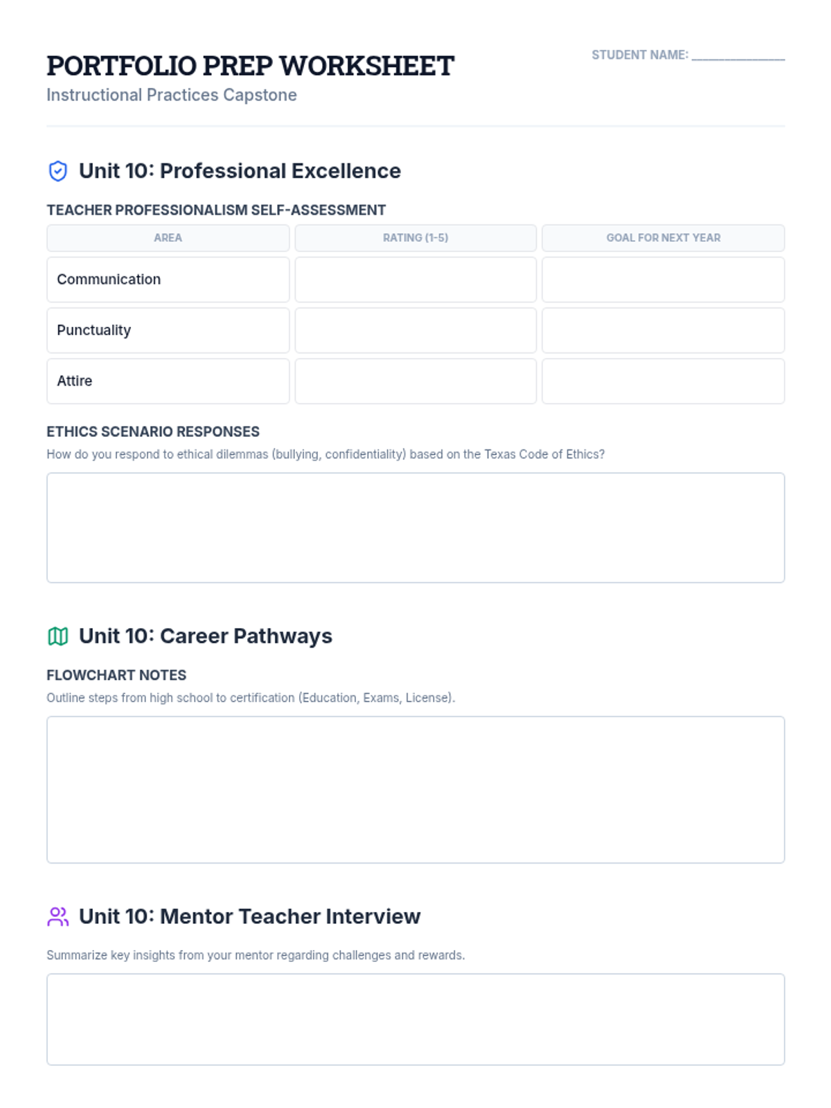 A comprehensive prep worksheet for students to complete the 'missing' unit activities required for their final portfolio, organized by unit and including reflections on feedback, ethics, and high-leverage practices.