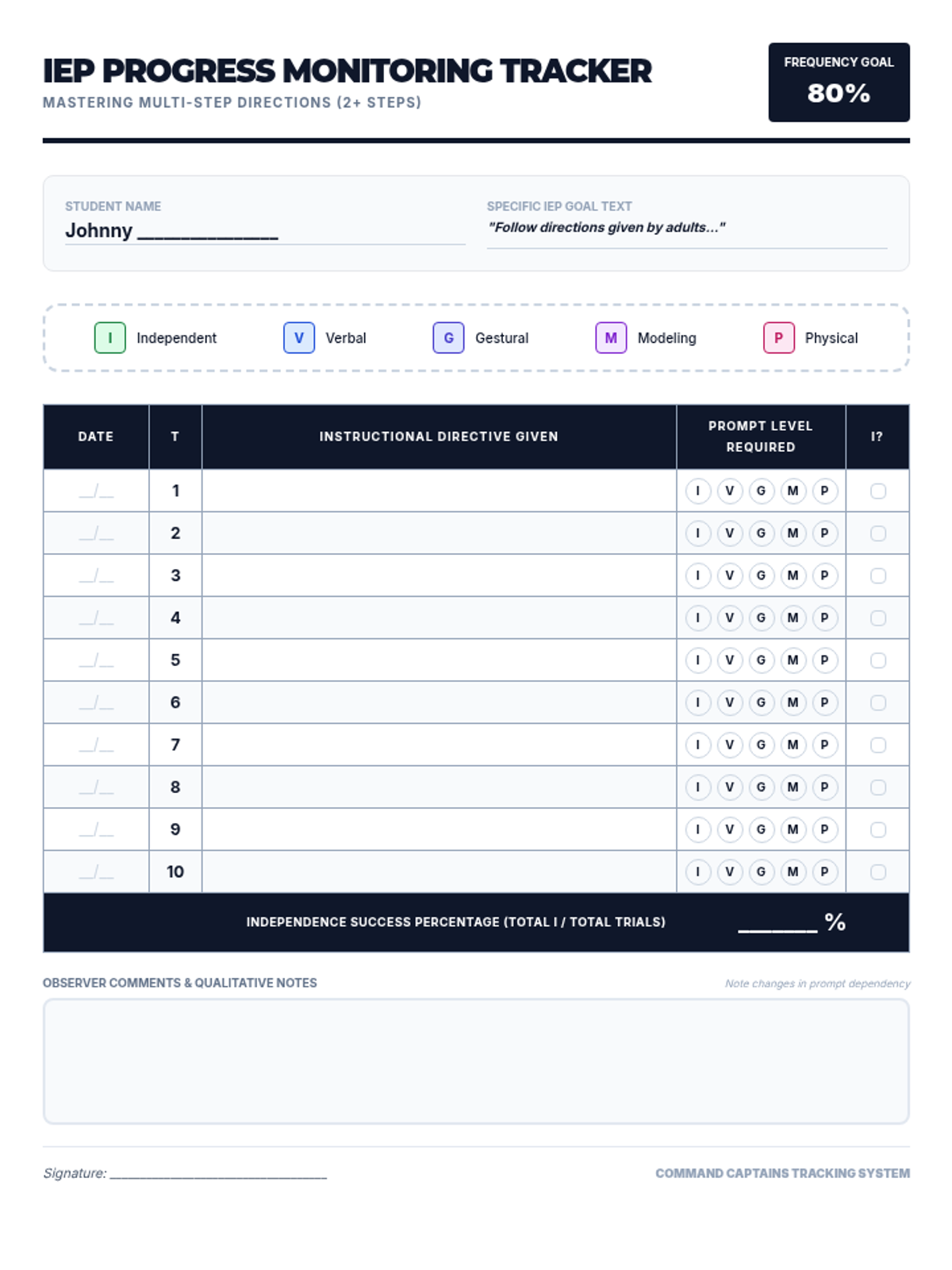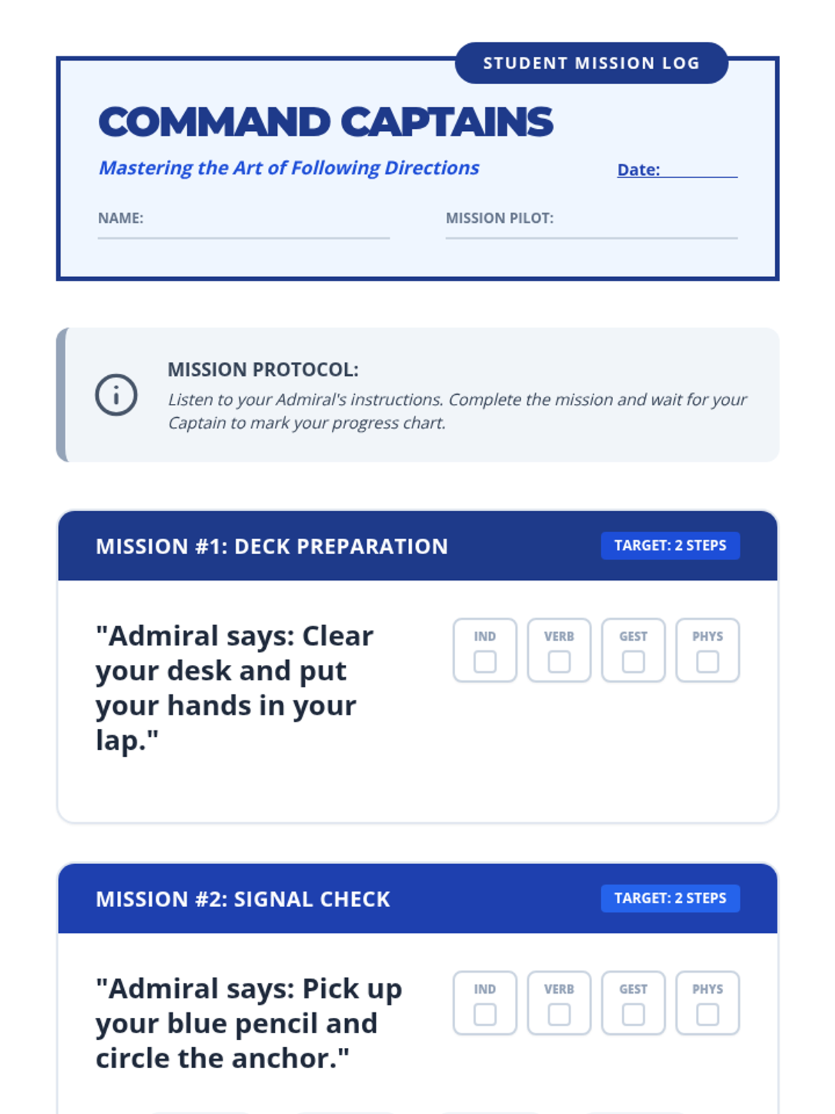 A student-facing mission log for practicing multi-step directions. It includes visual cues for directions and a built-in prompt tracking area for the teacher to quickly monitor progress during the lesson.