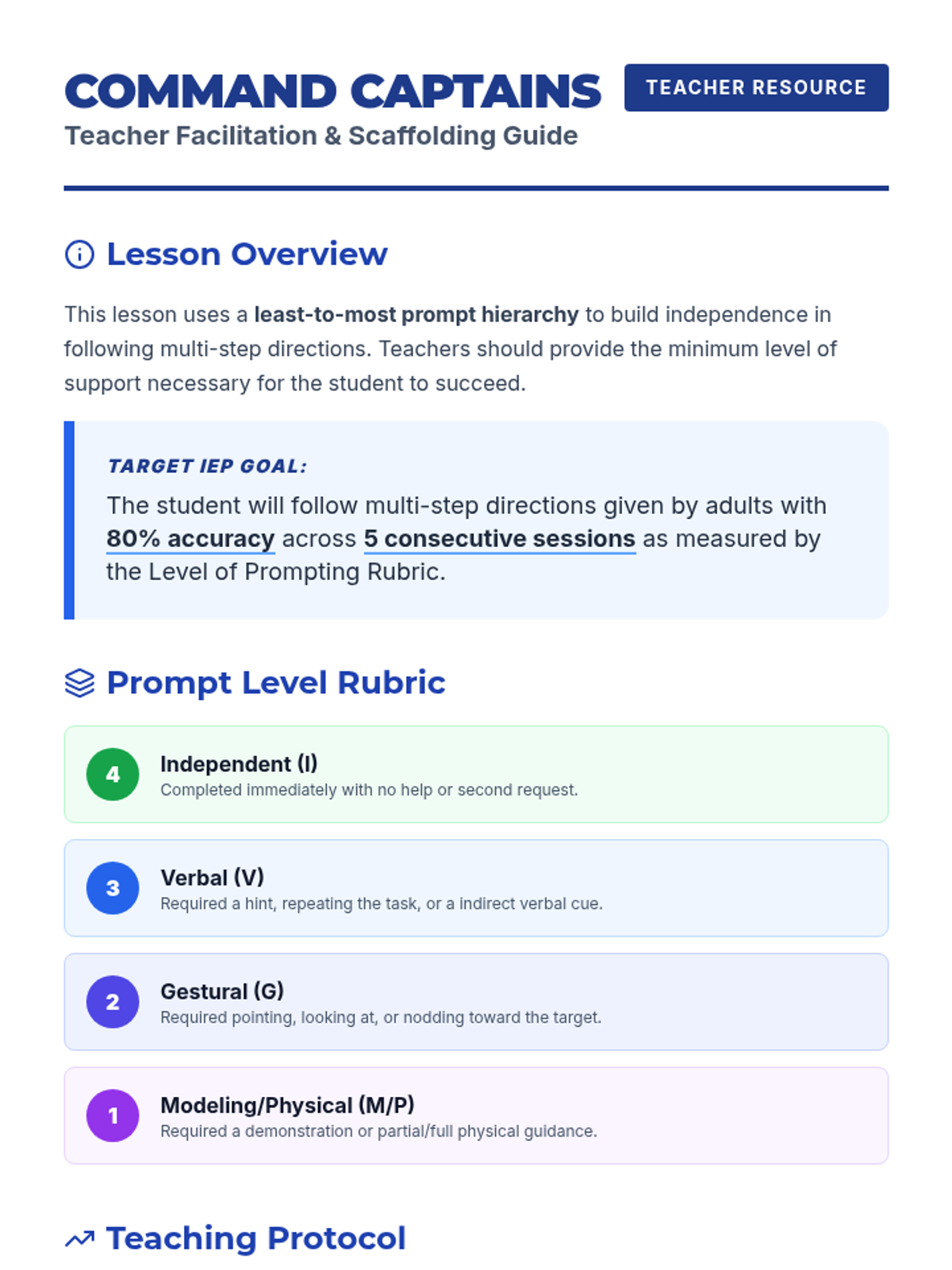 Visual slides for introducing the 'Command Captains' lesson on following directions. Includes a 'Prompt Ladder' visual for students to understand the scaffolding process.