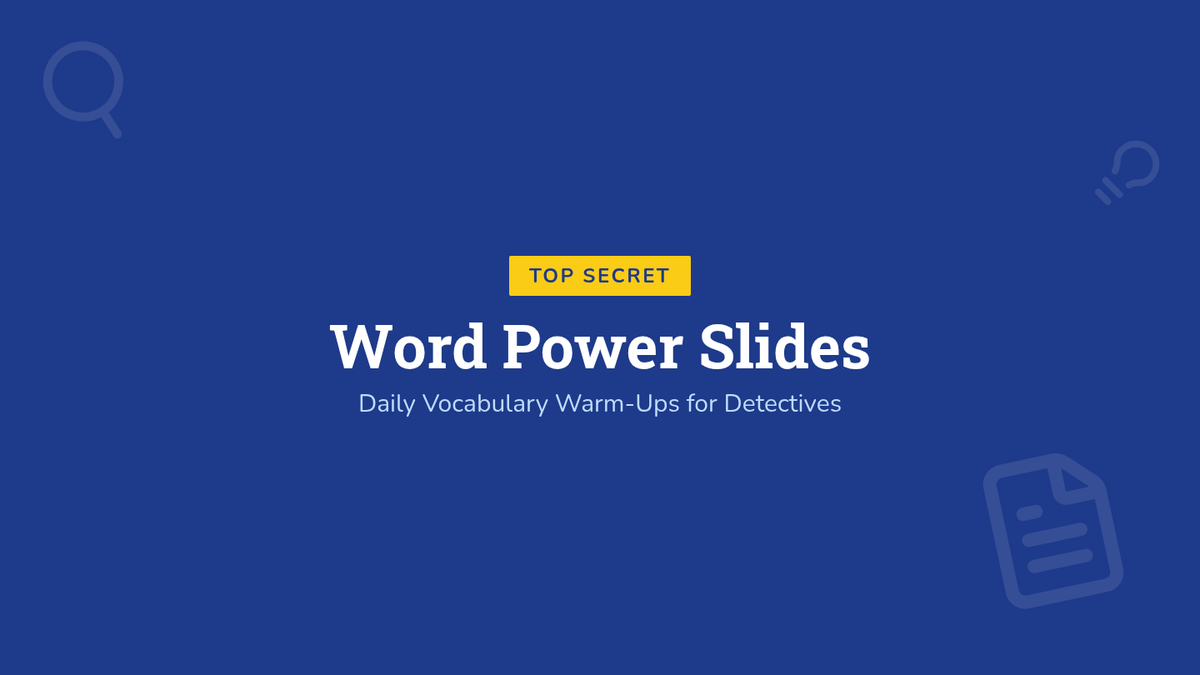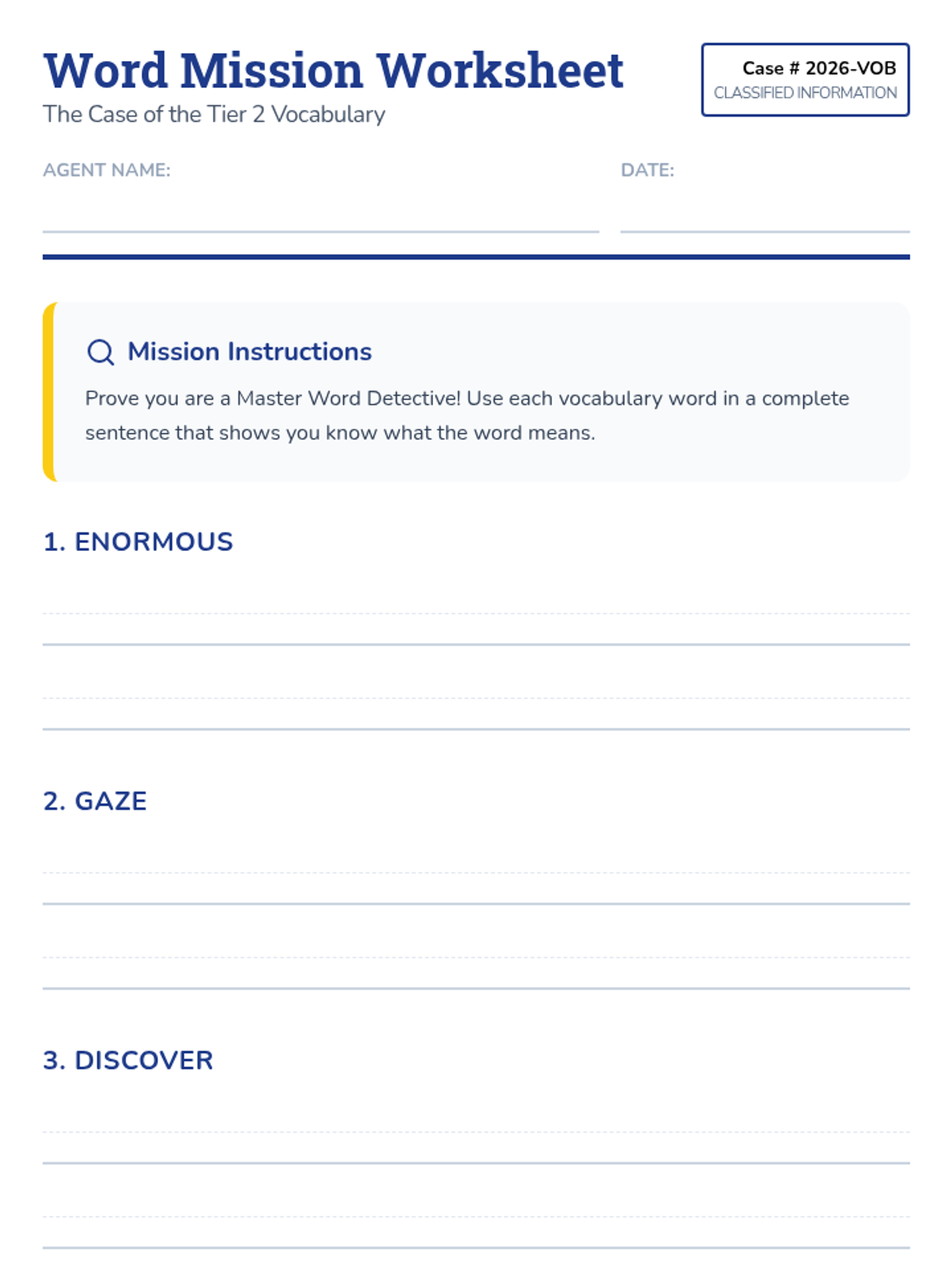 Revised 2nd-grade vocabulary worksheet with single-column primary handwriting lines, improved page breaks, and a detective-themed design.