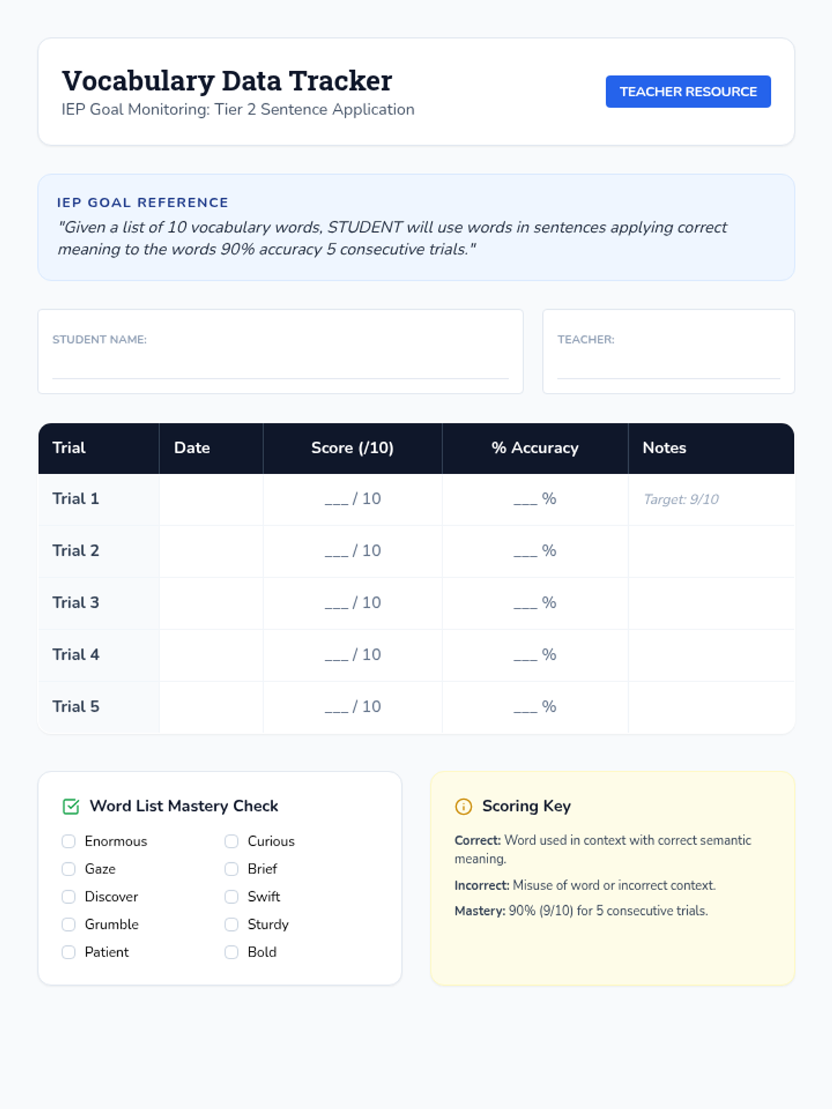 A teacher-facing data collection tool designed to track progress toward a specific IEP goal for independent work, including a frequency log and prompt tracker.