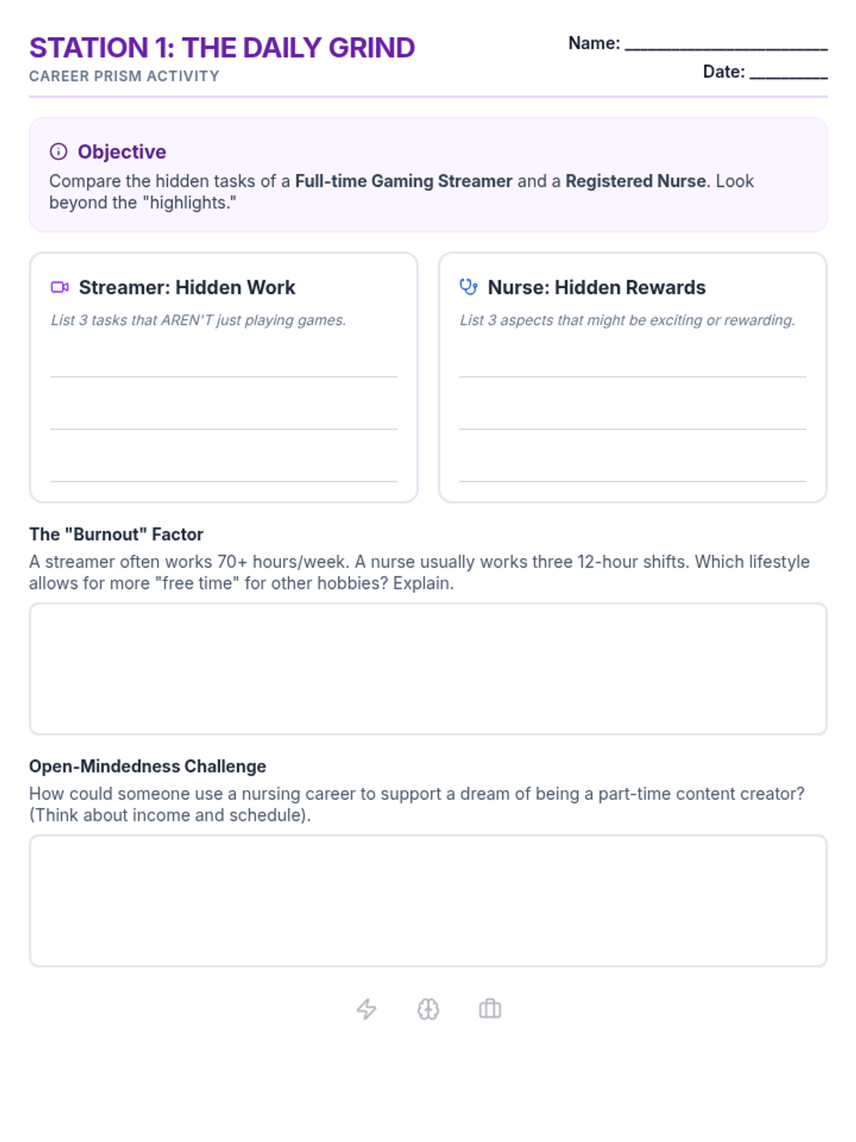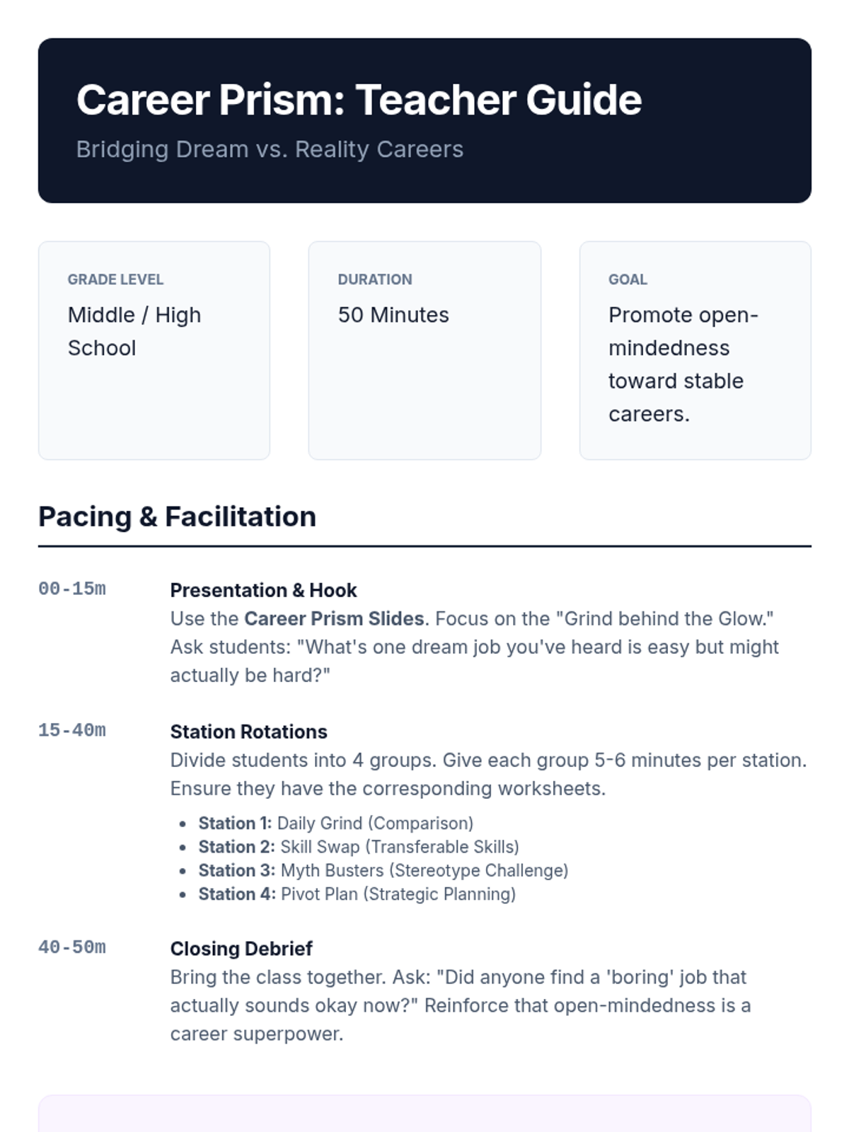A comprehensive teacher guide for facilitating the Career Prism lesson, including pacing, discussion prompts, and station setup.