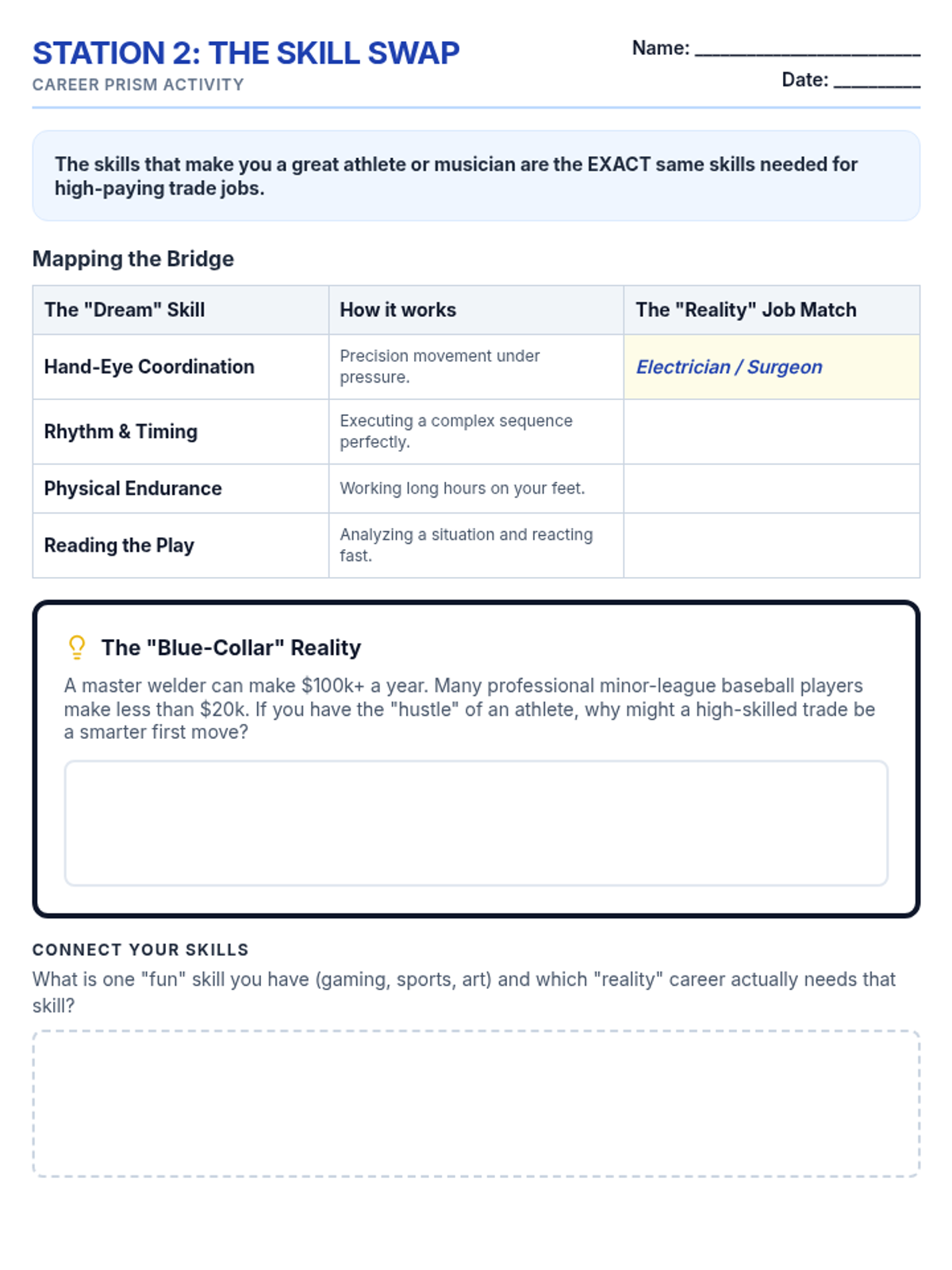 Station 2 activity helping students translate skills from sports and music into high-demand trade and professional careers. Revised for single-page layout and improved printability.