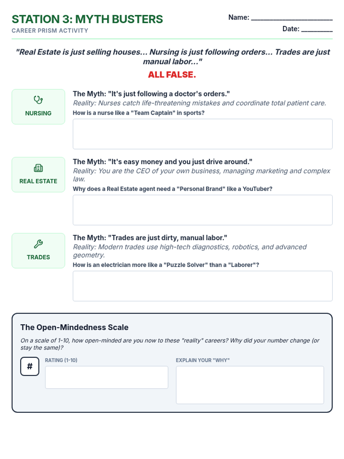 Station 3 activity debunking myths about traditional and trade careers. Revised for single-page fit, improved legibility, and white work areas.