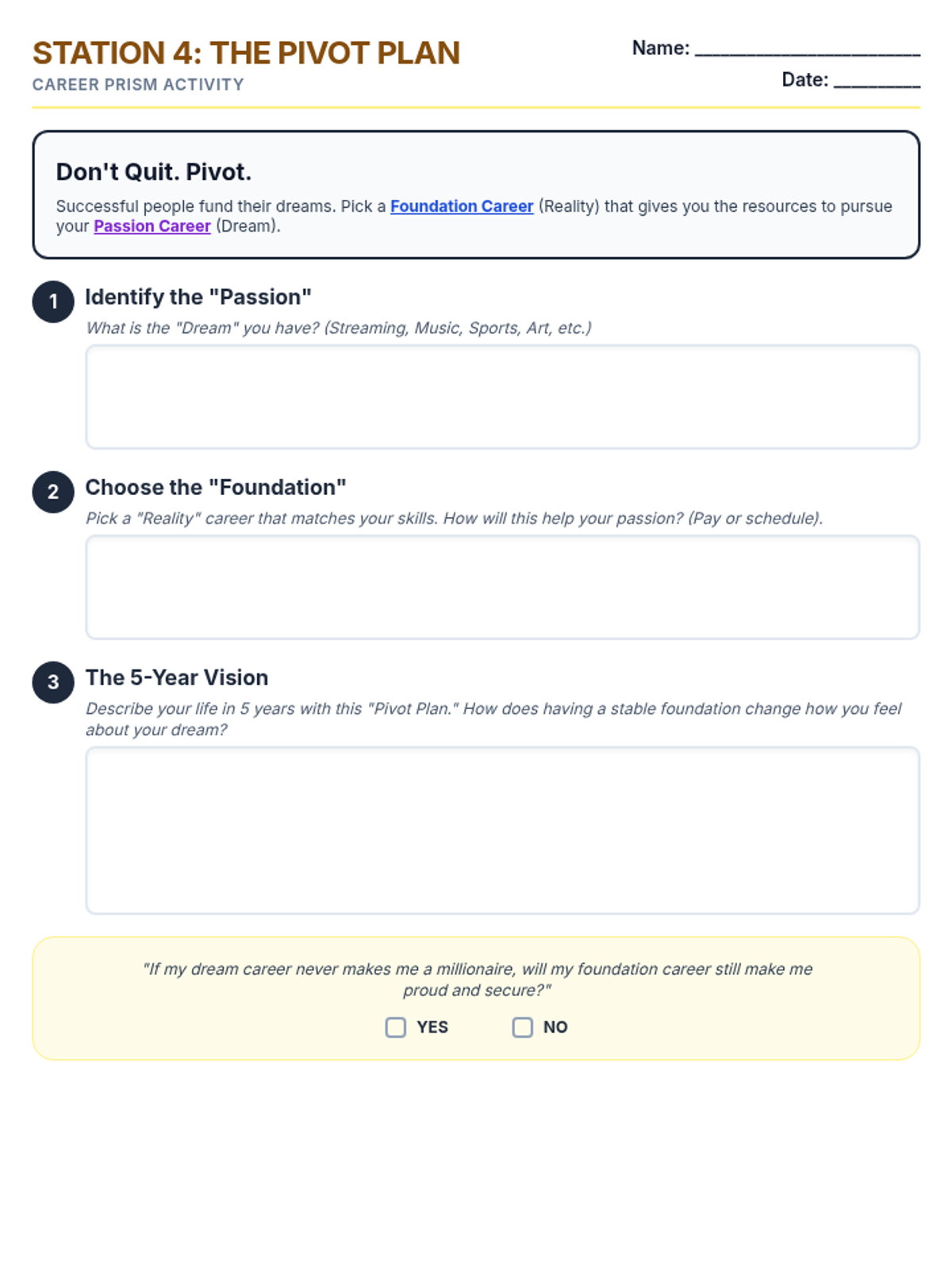 Station 4 activity for creating a 'Pivot Plan'. Revised for single-page layout, optimized writing spaces, and improved visual alignment.
