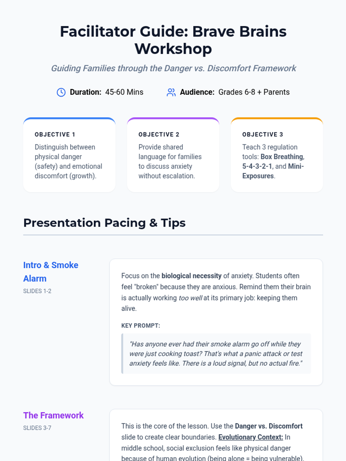 A facilitator guide for educators or counselors delivering the Brave Brains workshop. Includes pacing tips, pedagogical background on anxiety, and key discussion prompts for families.