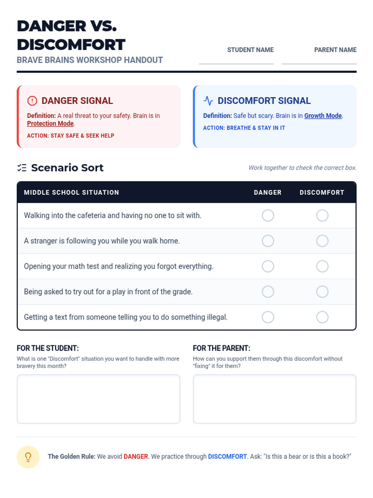 A co-working handout for middle school students and parents to categorize anxiety scenarios into danger or discomfort. Features a sorting activity and reflection questions to improve communication and emotional regulation.