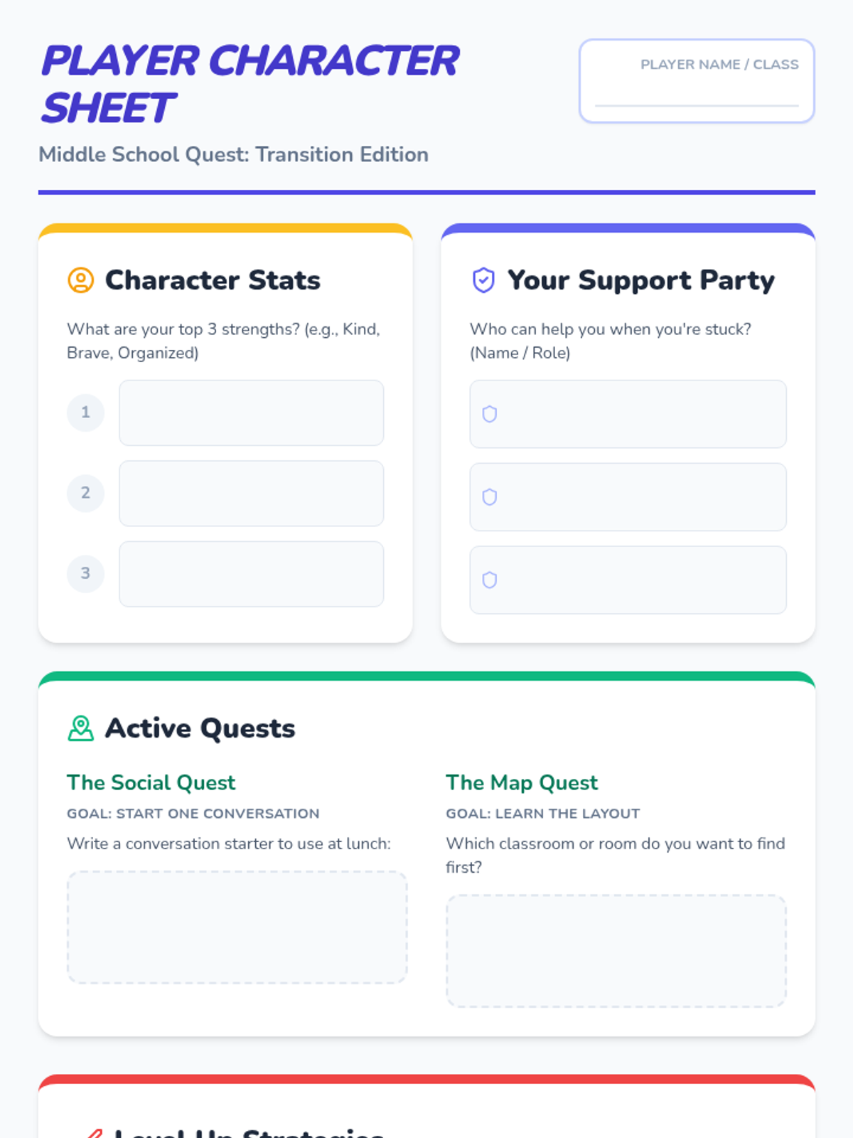 A student worksheet designed as a 'Character Sheet' to accompany the transition game. Students identify their personal strengths, identify supportive adults, brainstorm conversation starters, and practice problem-solving for common middle school challenges.