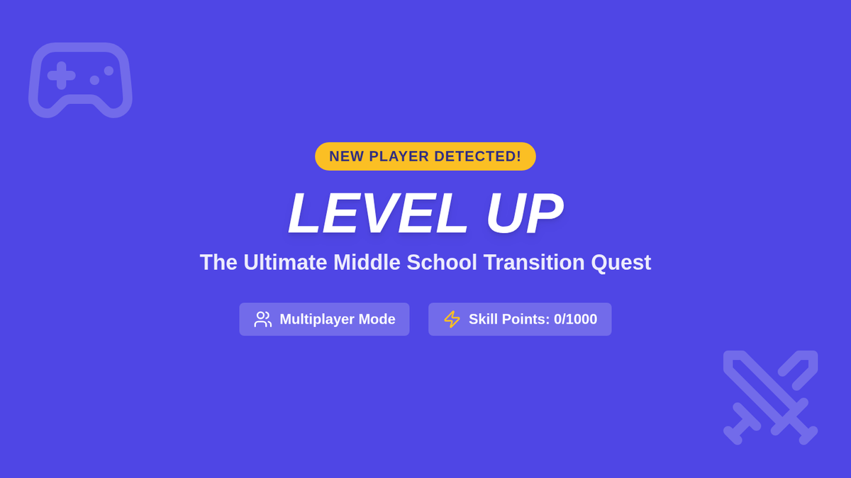 A gamified presentation to introduce incoming middle schoolers to their new environment. It includes scenario-based levels focused on meeting new people, navigating changes like lockers and schedules, and choosing good friends, all with a retro-gaming 'Level Up' aesthetic.