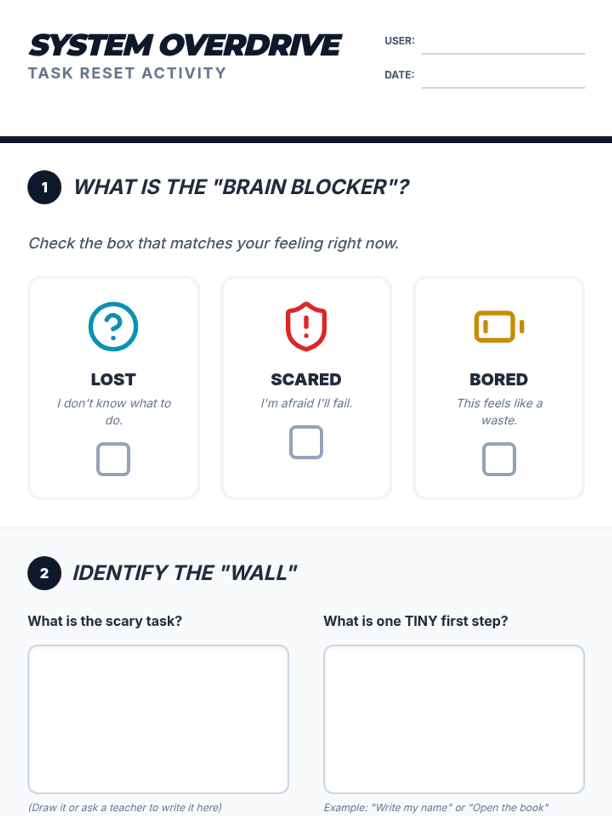 A visual activity sheet for 9th-grade students with low literacy to identify brain blockers and choose strategies for overcoming task avoidance. Revised with better page break management, darker text for accessibility, and clearer input boundaries.