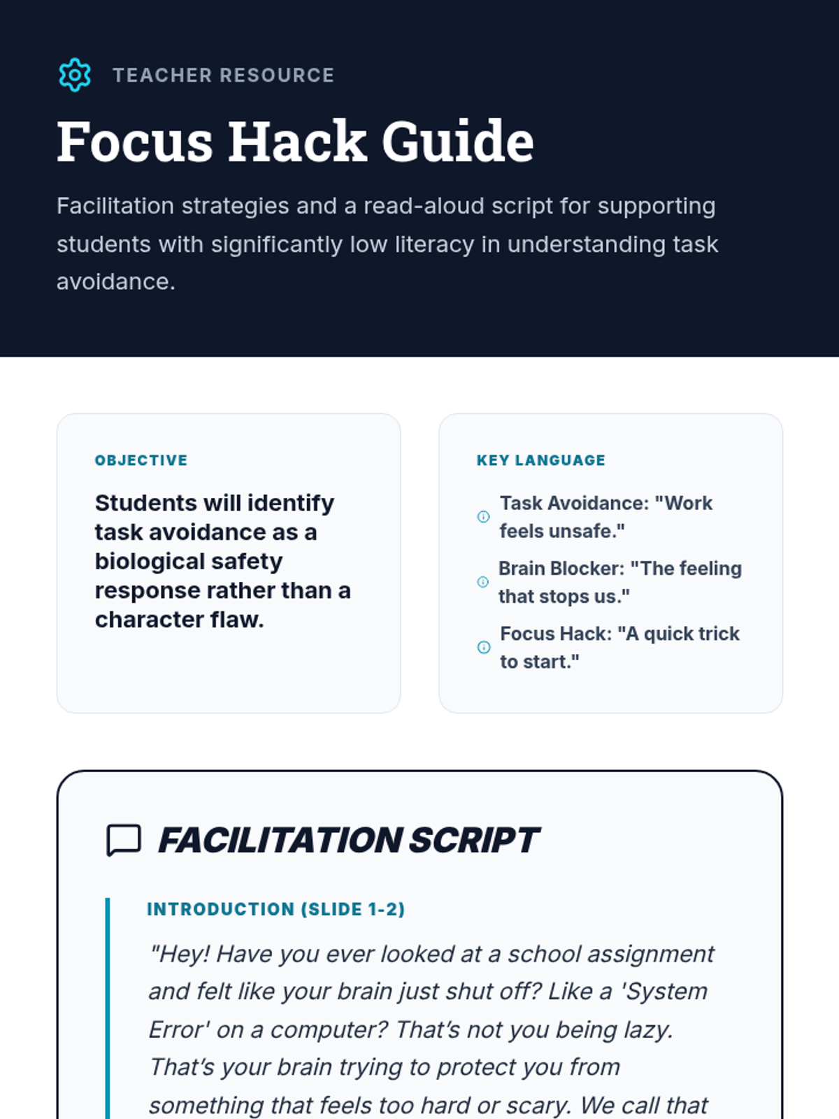 A comprehensive teacher guide for facilitating the 'Focus Hack' lesson with students who have low literacy skills. Revised for better layout balance, script continuity, and page break management.
