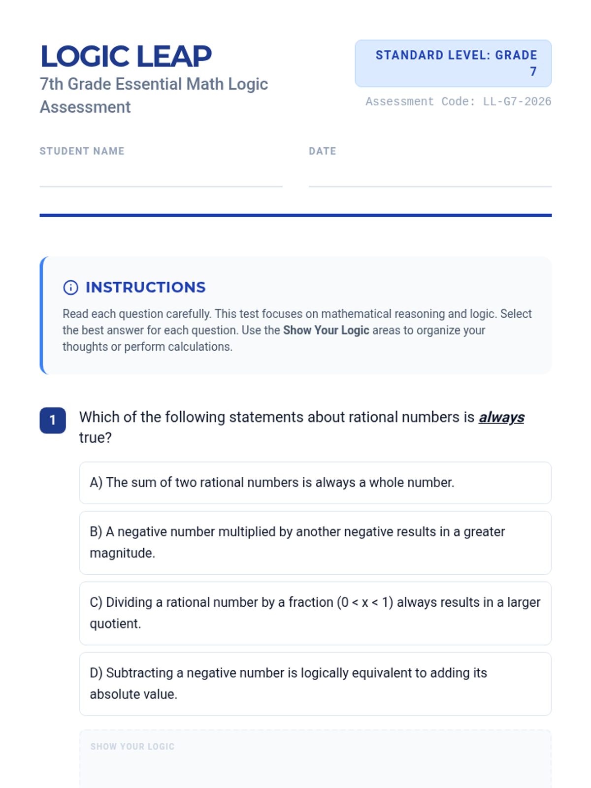 A clear and readable teacher solutions guide for the Logic Leap assessment, featuring expanded logical explanations and standardized formatting.