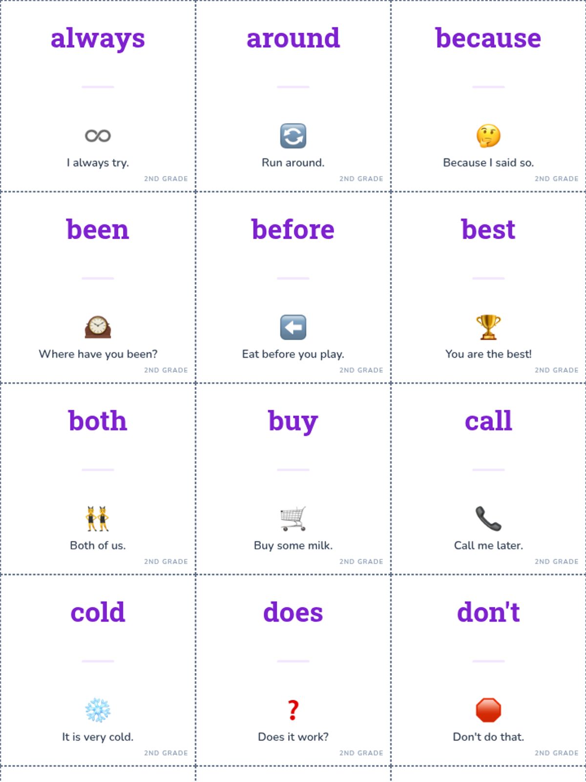 Complete set of Dolch 2nd Grade sight word flashcards, formatted with 12 words per page and dashed lines for easy cutting. Each card features the word big and bold, a matching sentence, and a visual.