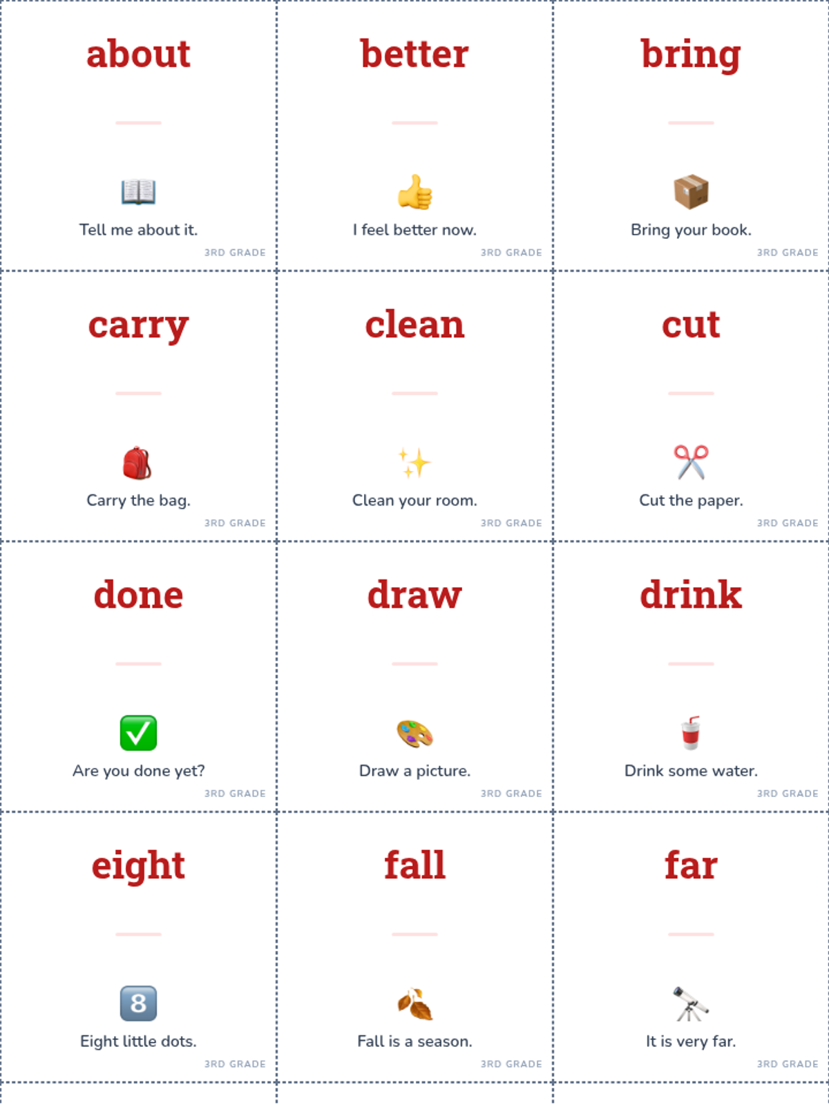 Complete set of Dolch 3rd Grade sight word flashcards, formatted with 12 words per page and dashed lines for easy cutting. Each card features the word big and bold, a matching sentence, and a visual.