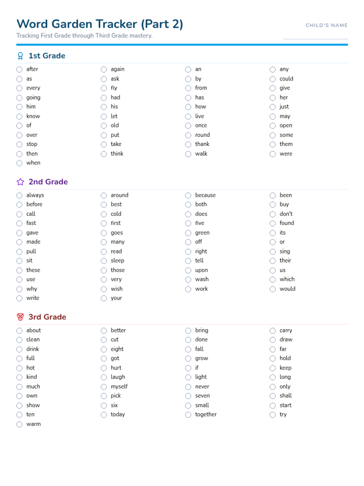 The second part of the Word Garden tracker, covering Dolch First Grade, Second Grade, and Third Grade sight words on a single efficient page.