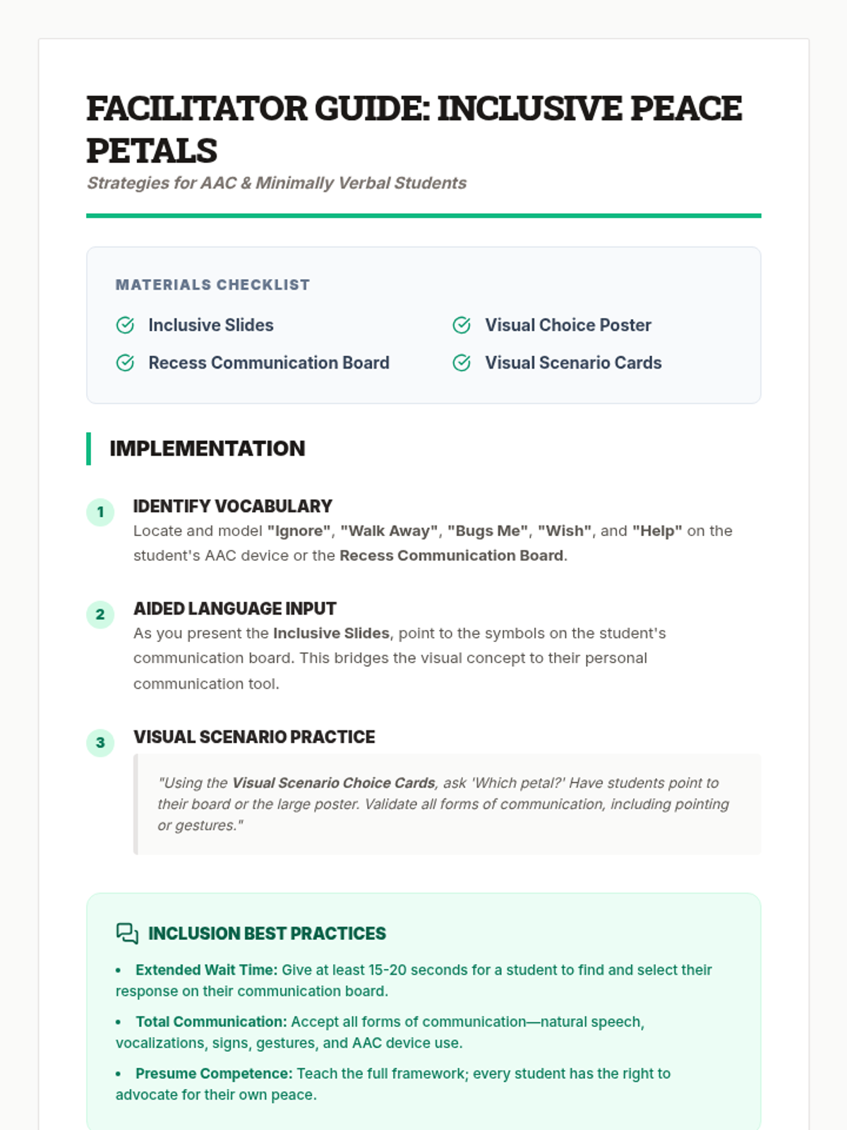 A teacher-facing facilitator guide for the inclusive 'Peace Petals' lesson, providing specific strategies for supporting students who are minimally verbal or use AAC.
