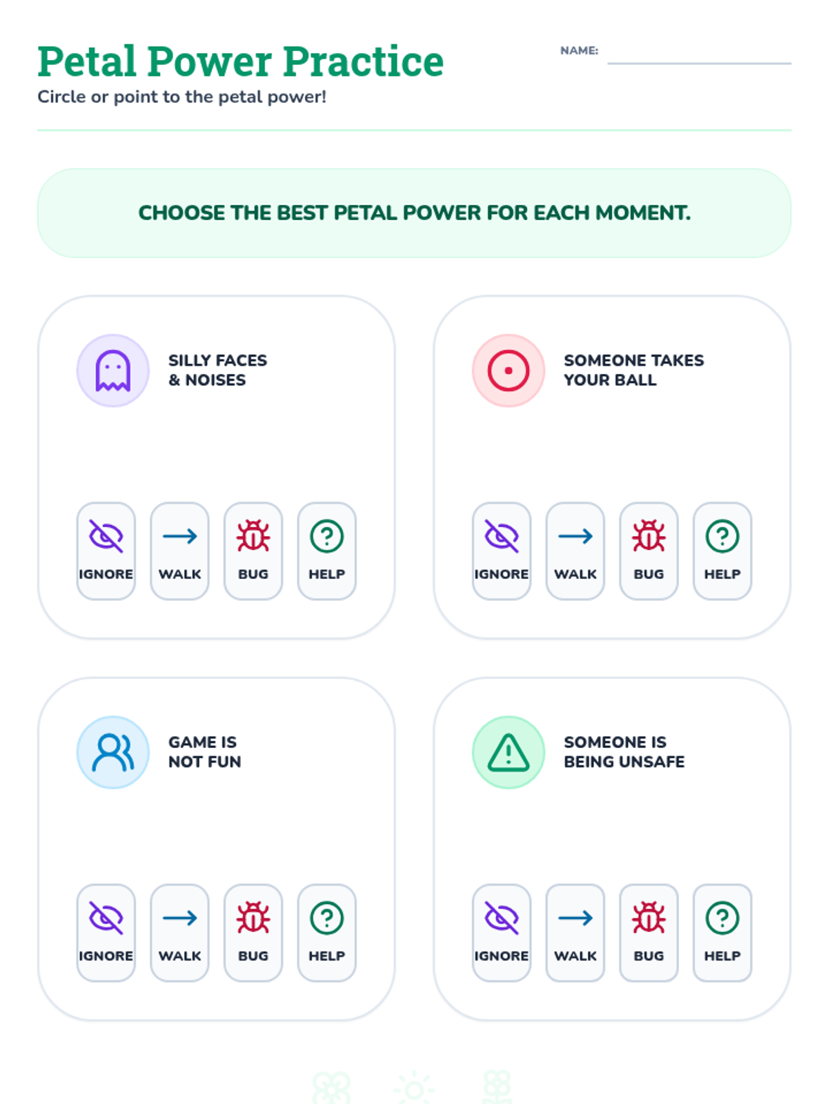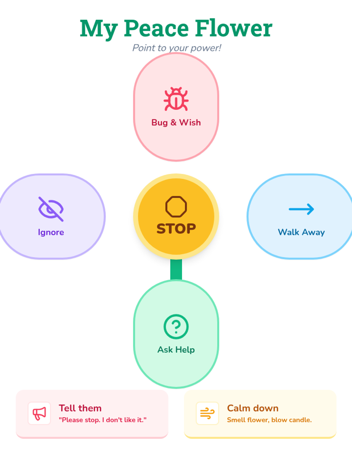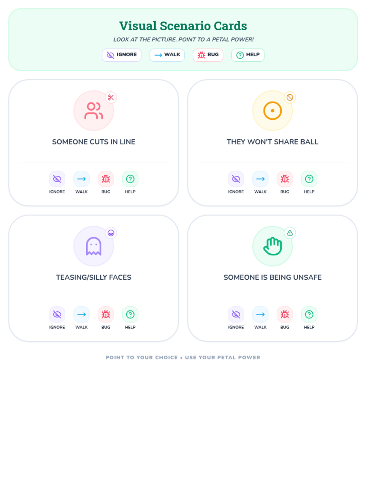 Visual scenario cards designed for students who are minimally verbal or use AAC. Each card features a clear, icon-based conflict and a selection of the four Peace Petals for easy communication and choice-making.