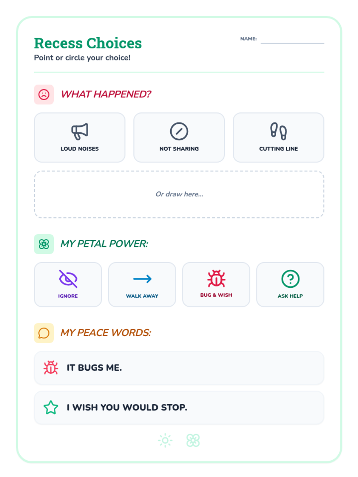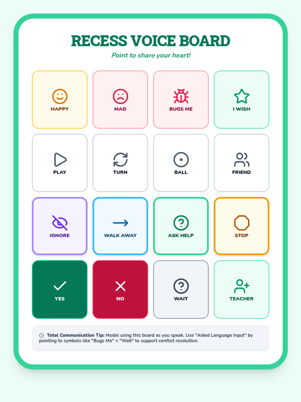 A specialized communication board for recess, featuring key vocabulary for conflict resolution, the four Peace Petals, and basic playground needs. Ideal for students using AAC or who are minimally verbal.