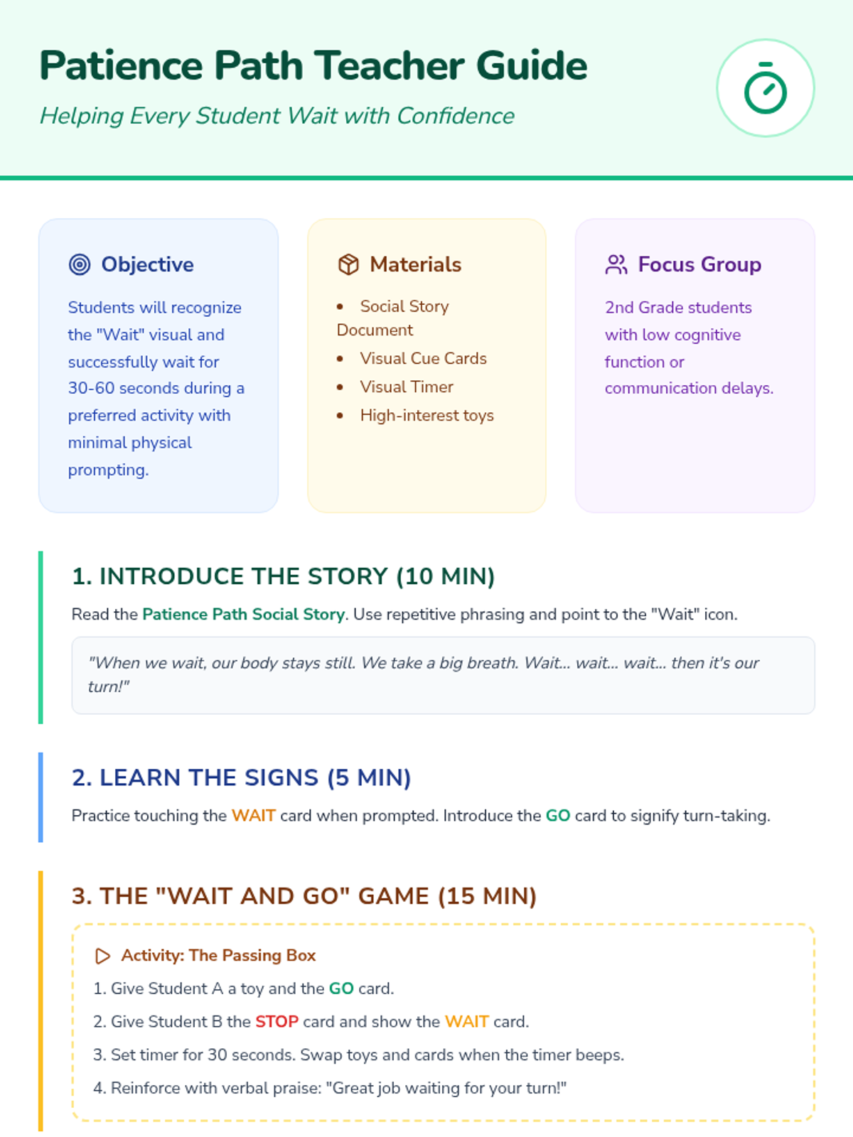 A simplified, high-visual social story for 2nd graders with low cognitive function, teaching the emotional and behavioral steps of waiting for a turn.