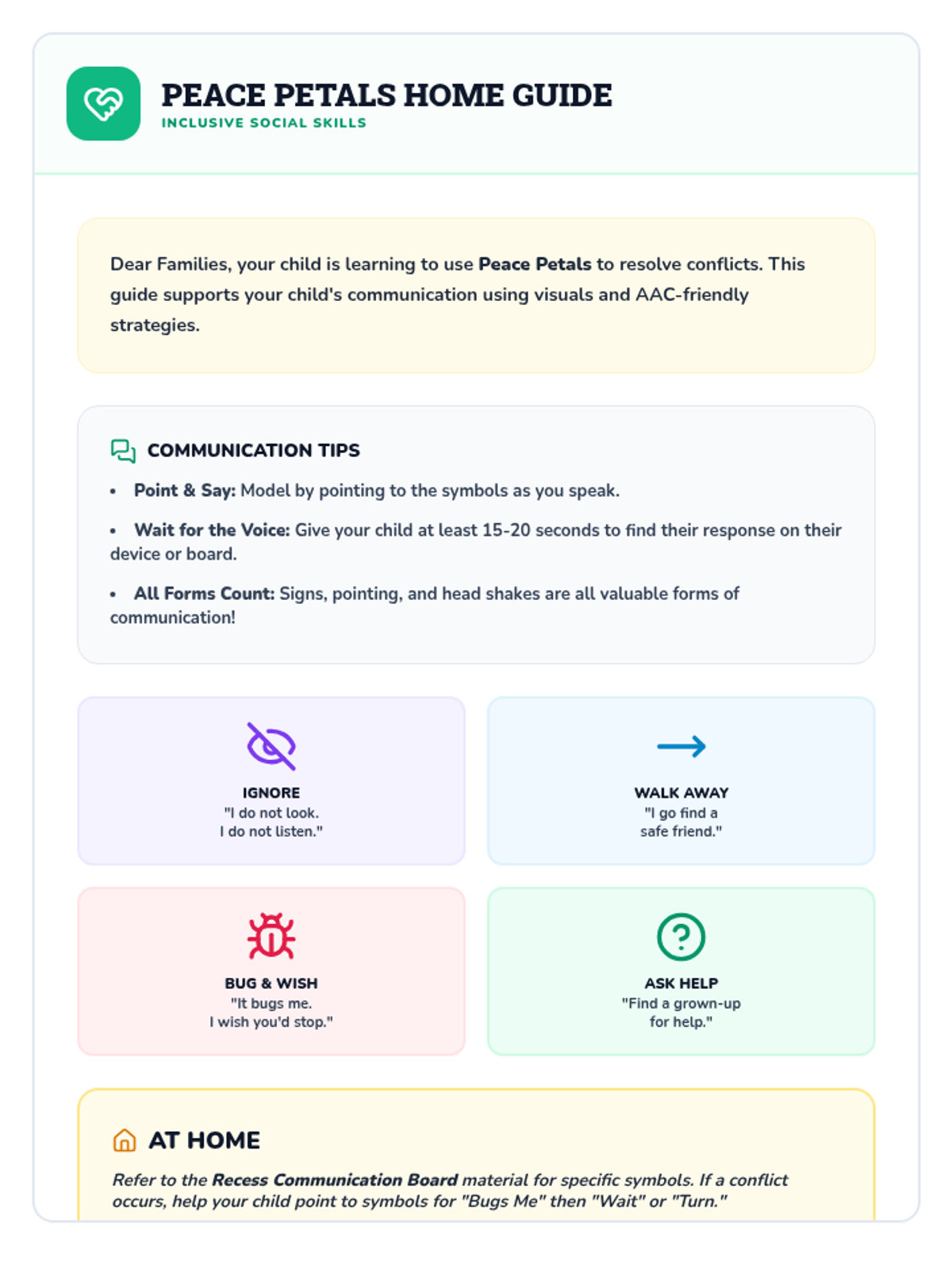 A parent handout designed to support inclusive conflict resolution at home, providing tips for families of students who use AAC or are minimally verbal to practice the 'Peace Petals' framework.