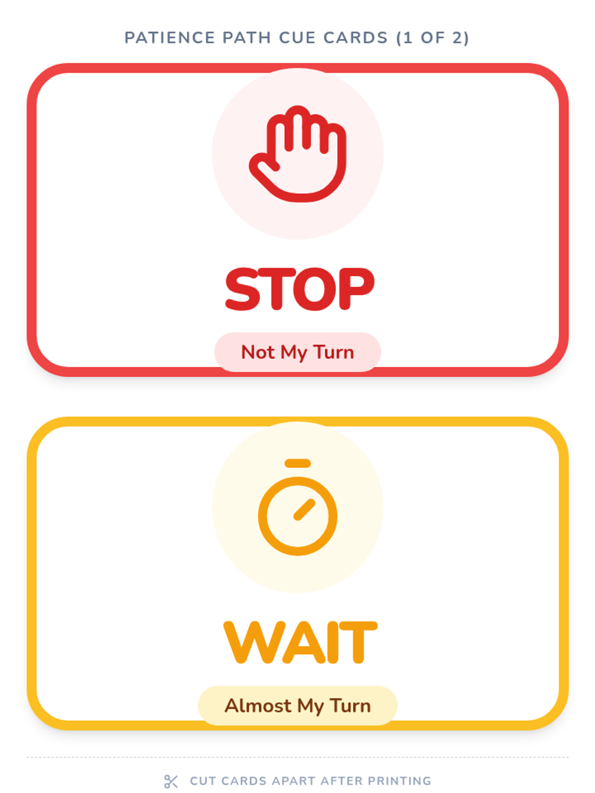 Large, high-contrast visual cue cards for classroom use, featuring "Stop," "Wait," "Go," and "Breathe" signals to support turn-taking transitions.