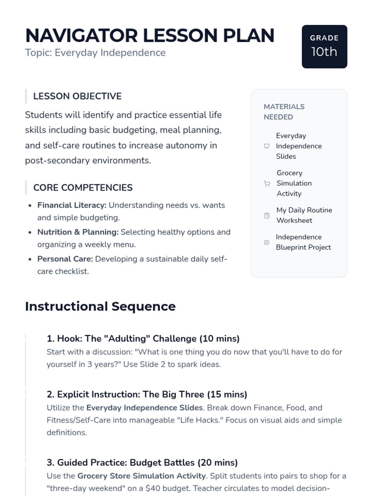 A detailed instructional guide for teachers, outlining the sequence for teaching independent living skills with specific IEP accommodations and assessment strategies.