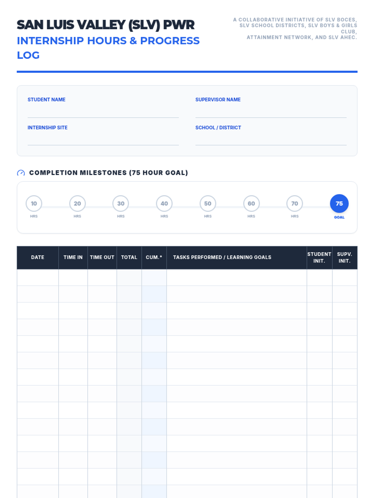 A professional internship hours log document designed in a spreadsheet format, featuring a milestone tracker for 10, 20, 30, 40, 50, 60, 70, and 75-hour intervals, with space for task recording and supervisor sign-offs.