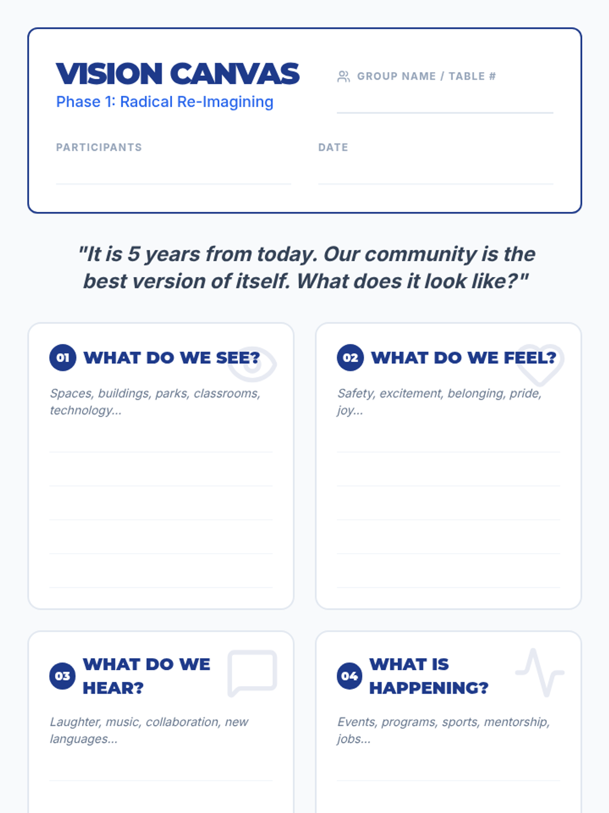 A comprehensive facilitator's guide providing a step-by-step agenda, materials checklist, and pedagogical tips for leading the Community Vision Workshop.