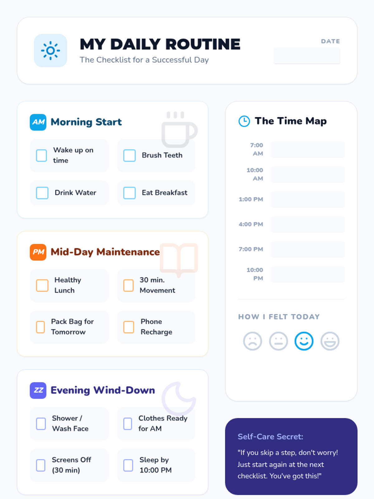 A structured daily routine checklist and time management tool designed to help students build consistent self-care and hygiene habits.