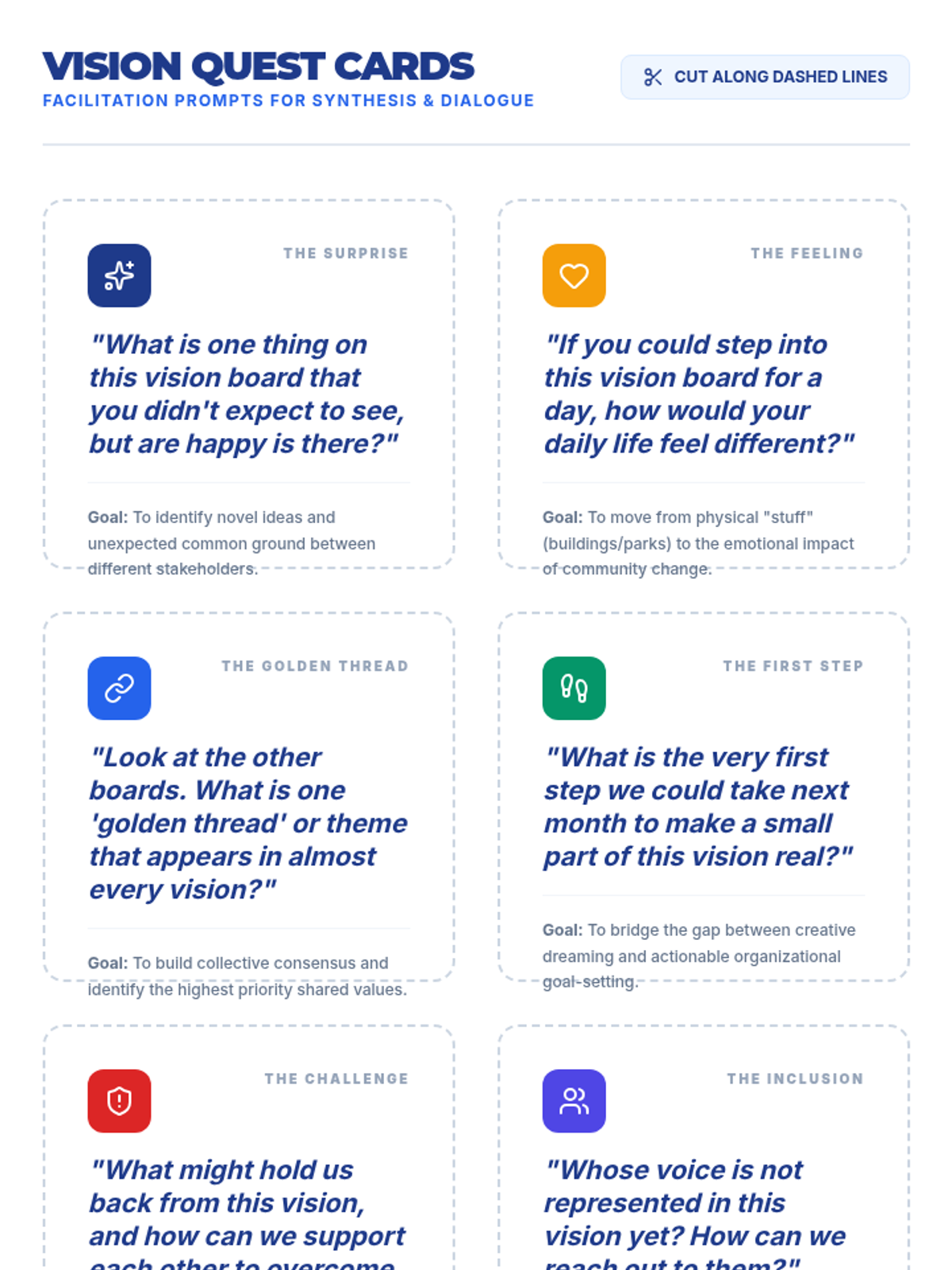 A set of printable facilitation cards with high-impact questions to guide community members through the synthesis and reflection phase of the workshop.