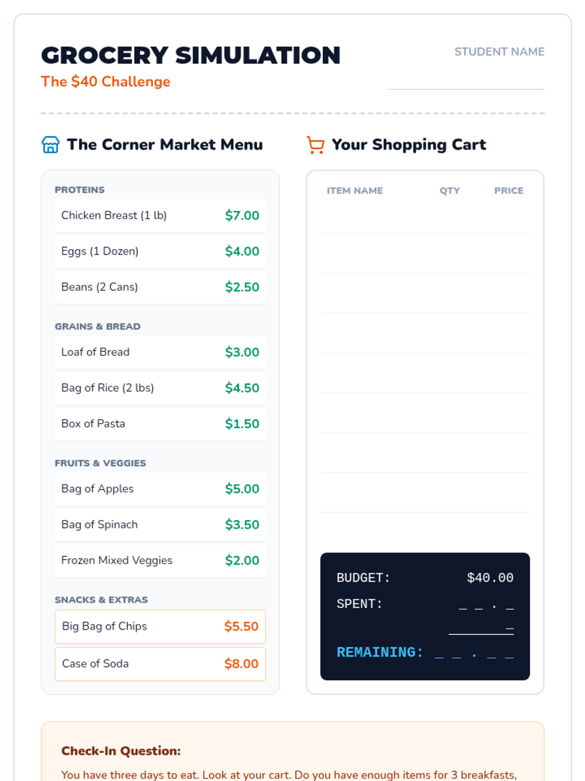 An interactive grocery shopping simulation worksheet where students practice budgeting with a fixed amount of money, revised with optimized student work areas for handwriting legibility.