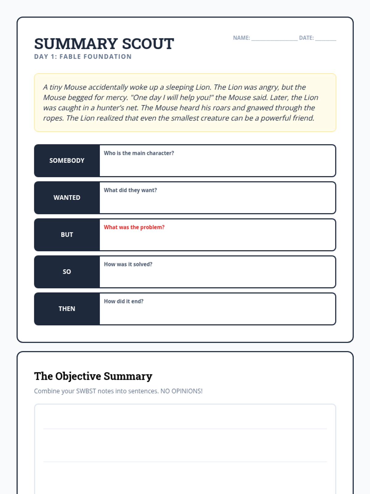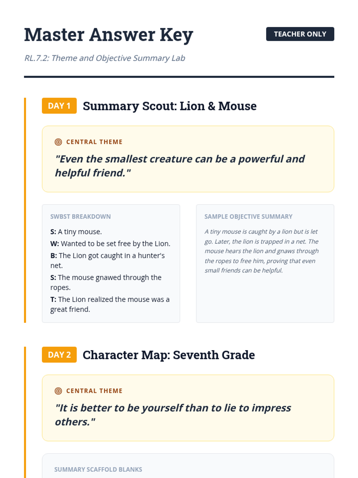 A detailed Day 2 lesson plan for teaching Problem/Solution and Sequence/Chronological structures, including discussion prompts and center activities.