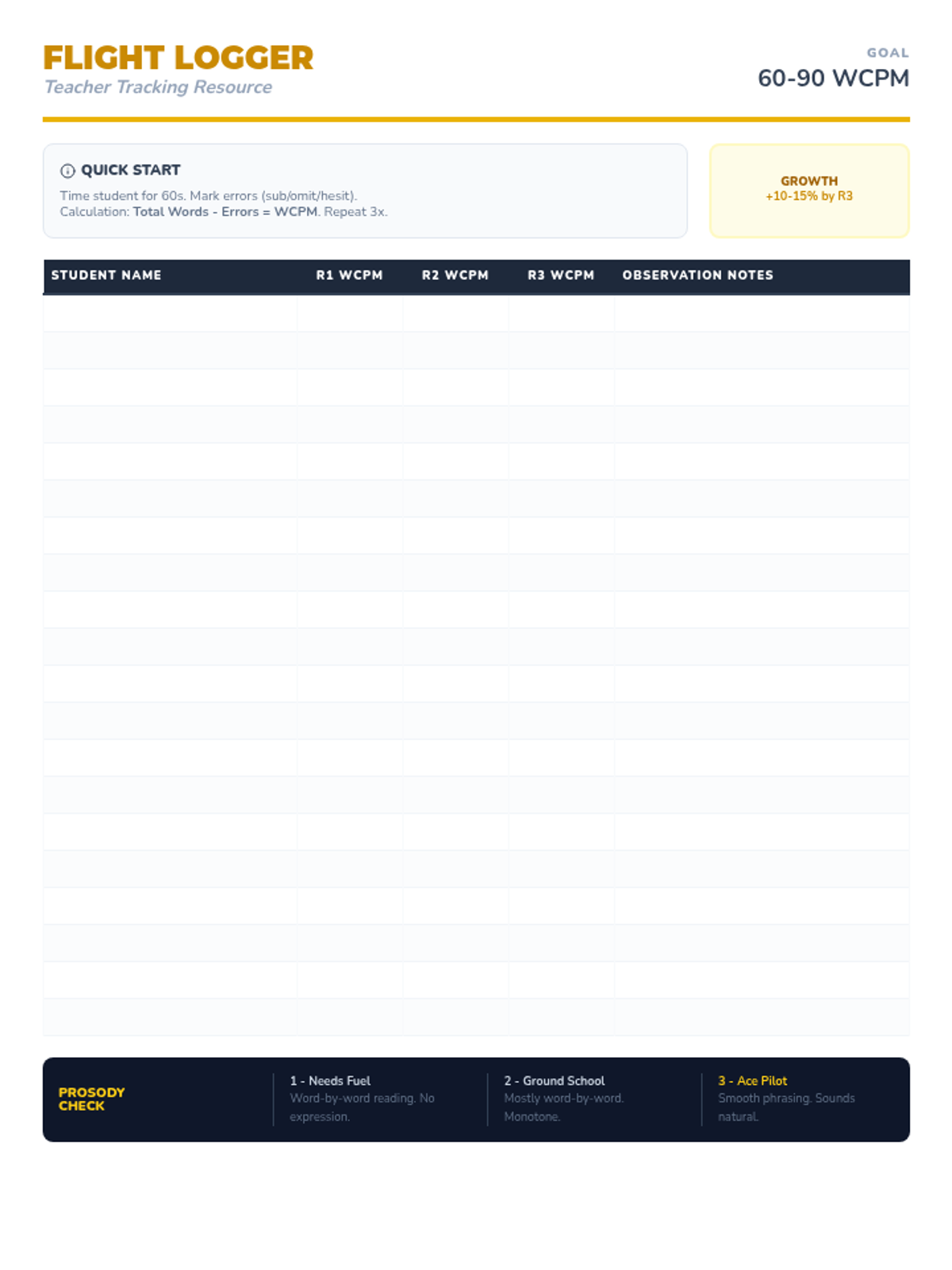 A teacher tracking resource for recording student reading rates (WCPM) across multiple attempts, including instructions and a quick prosody rubric. Revised to fit 20 students on a single page.