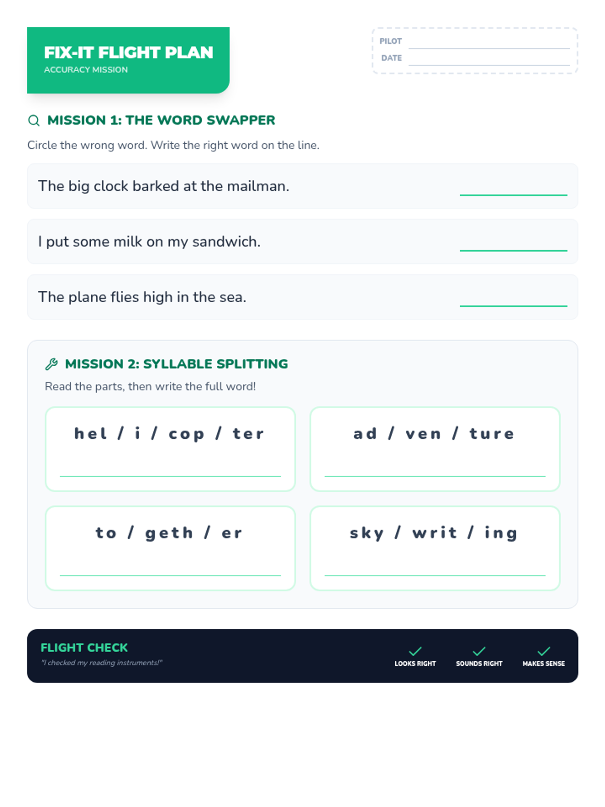 A student-facing activity sheet for practicing self-correction and accuracy. Includes 'word swap' detective work and syllable splitting for challenging aviation-themed words. Revised for better page layout and mission clarity.