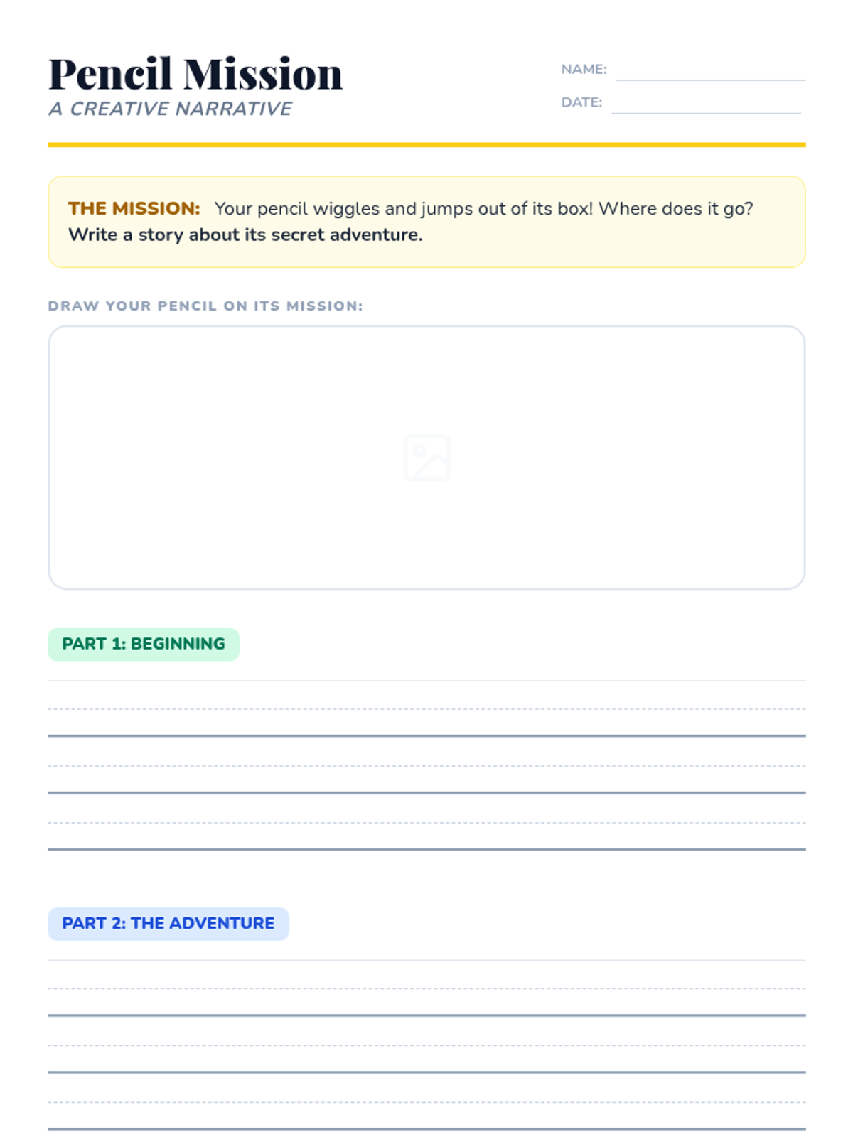 A student-facing narrative writing worksheet for 2nd grade. Includes primary-style writing lines (with midline), a drawing box, and a creative prompt about a secret pencil mission. Includes a self-check list at the bottom.