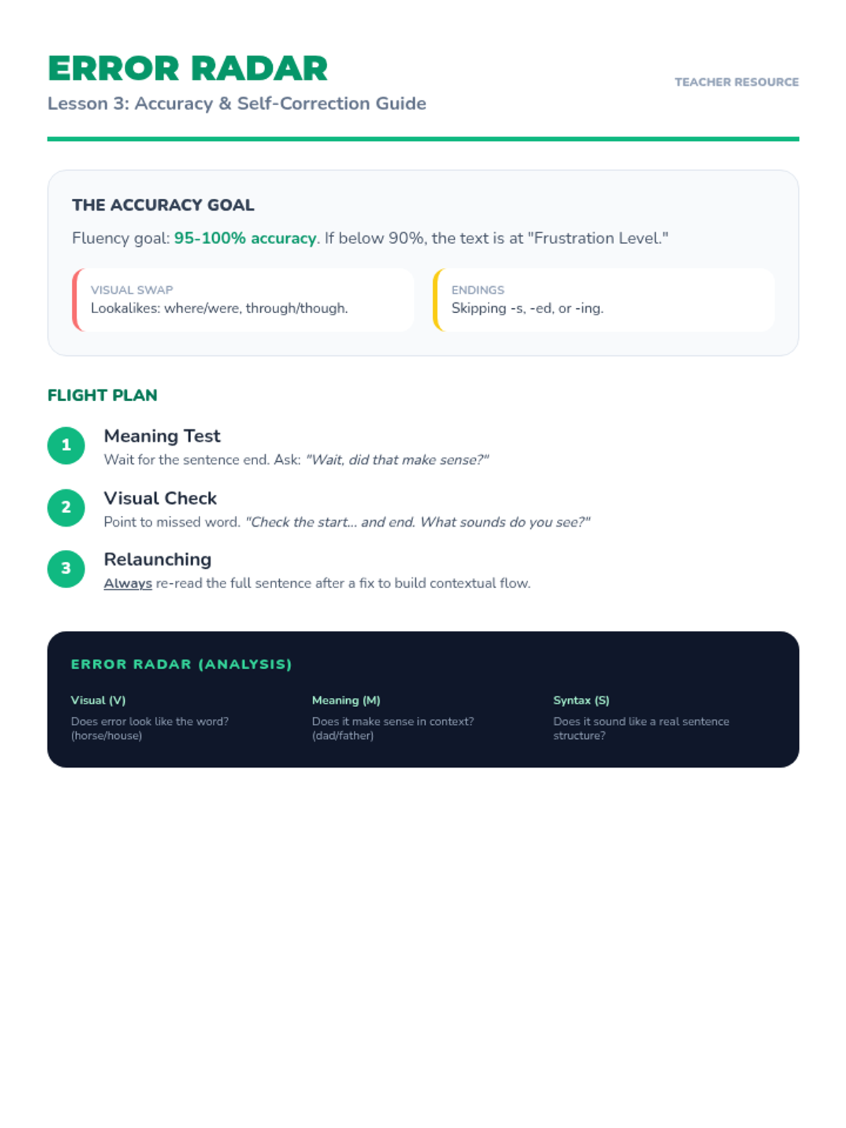 A slide deck for Lesson 3 focusing on reading accuracy and self-correction. It teaches students to recognize 'crashes' (errors) and use a 'repair kit' to fix them. Revised with theme-appropriate icons and high-contrast visuals.