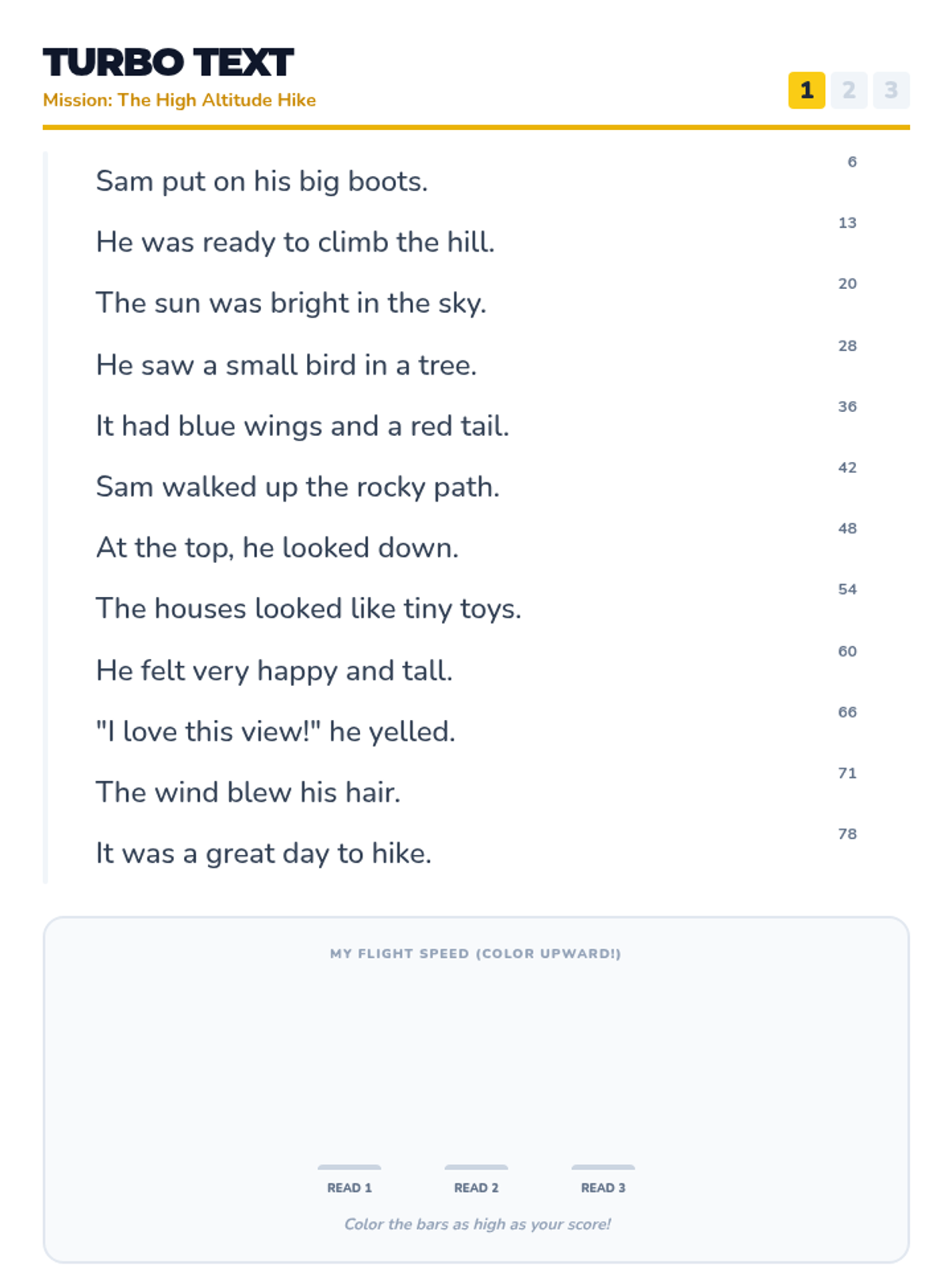 A high-interest reading passage with word counts for fluency tracking. Includes a visual bar graph for students to track their progress across three attempts. Revised to fit everything on a single page.