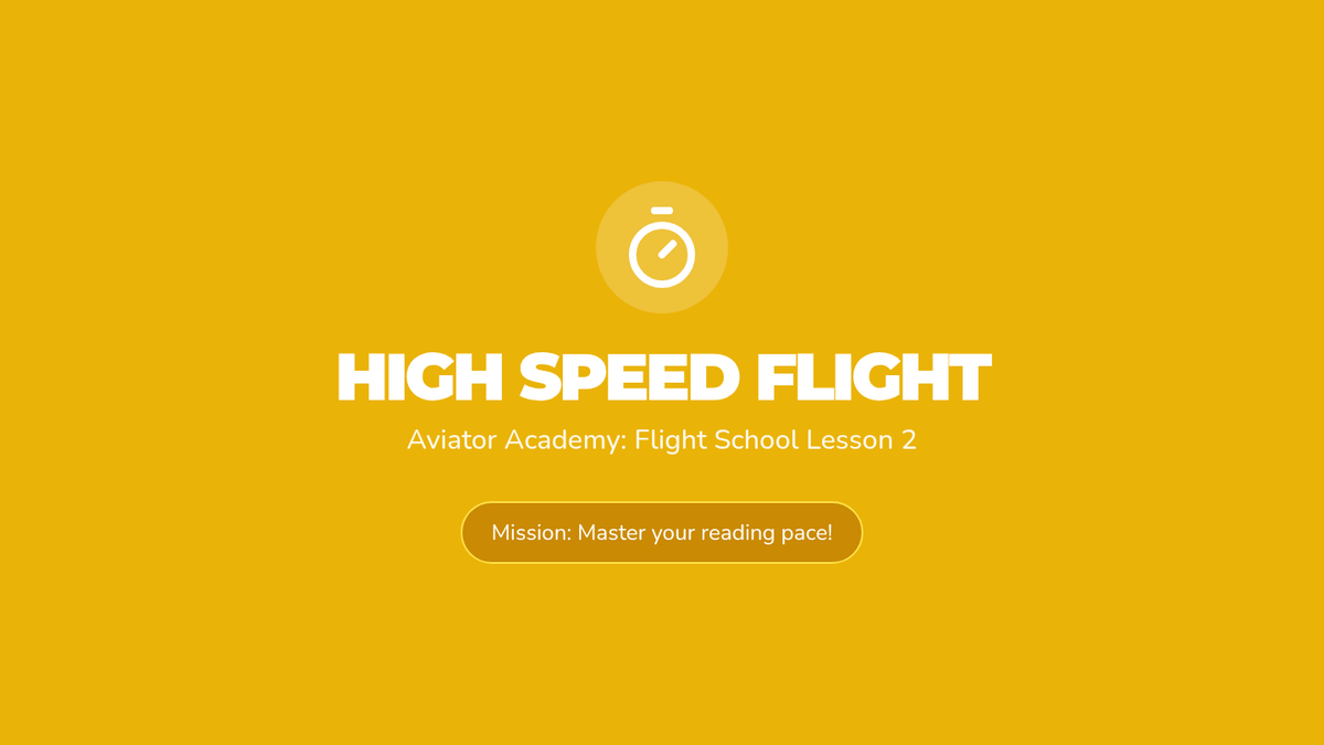 A slide deck for Lesson 2 focusing on reading rate. It uses a racing/aviation theme to explain the concept of 'pacing' and the importance of repeated reading for speed.